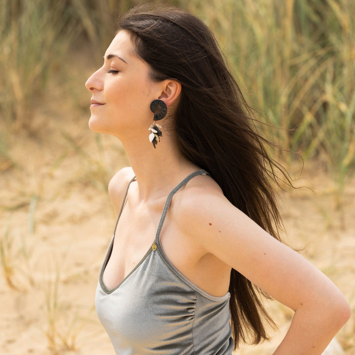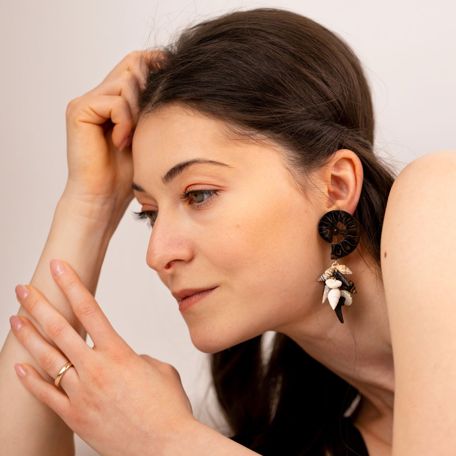 The Sea Treasures Dangle Earrings by Oanasavu.creations are a one-of-a-kind accessory inspired by the natural beauty and evolution of the sea. These meticulously handcrafted earrings feature ethically sourced ammonite fossils from 25,000 years ago, seashells, and shark teeth. They are a magnificent tribute to nature's unique shapes and the golden ratio, making them a wearable piece of history.
