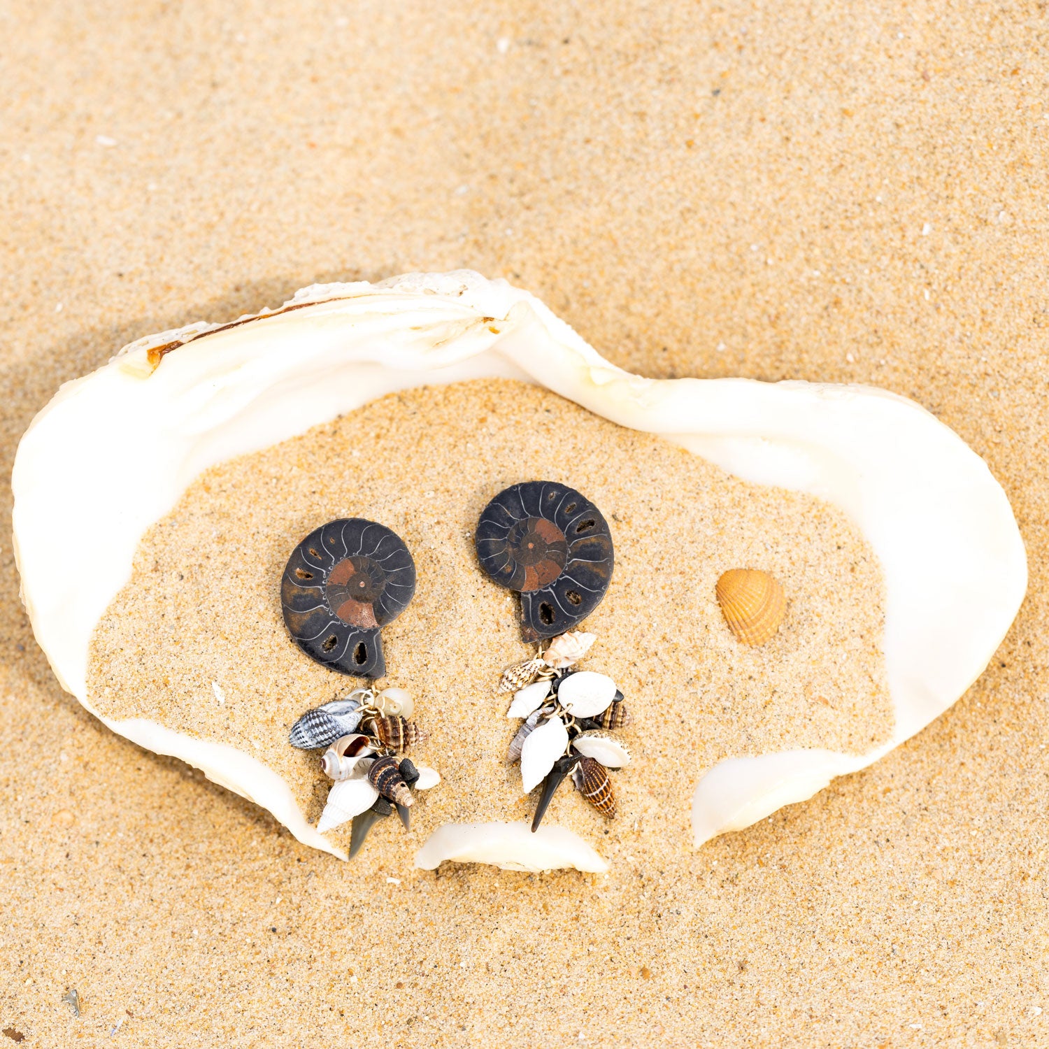 These handmade earrings contain seashells, ammonite fossils, and shark teeth fossils. They are finished with gold-plated ear clips and silicone protectors.
