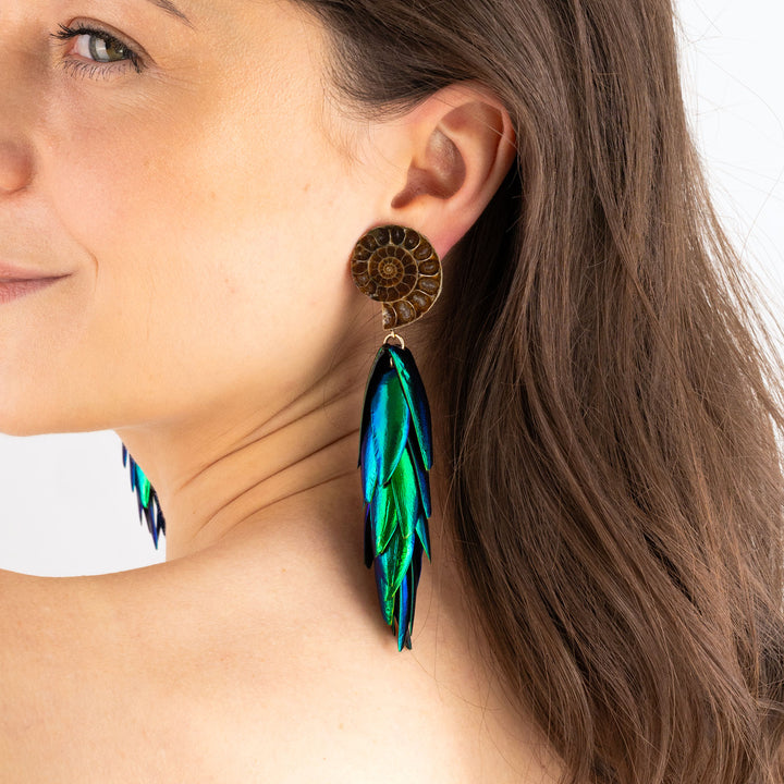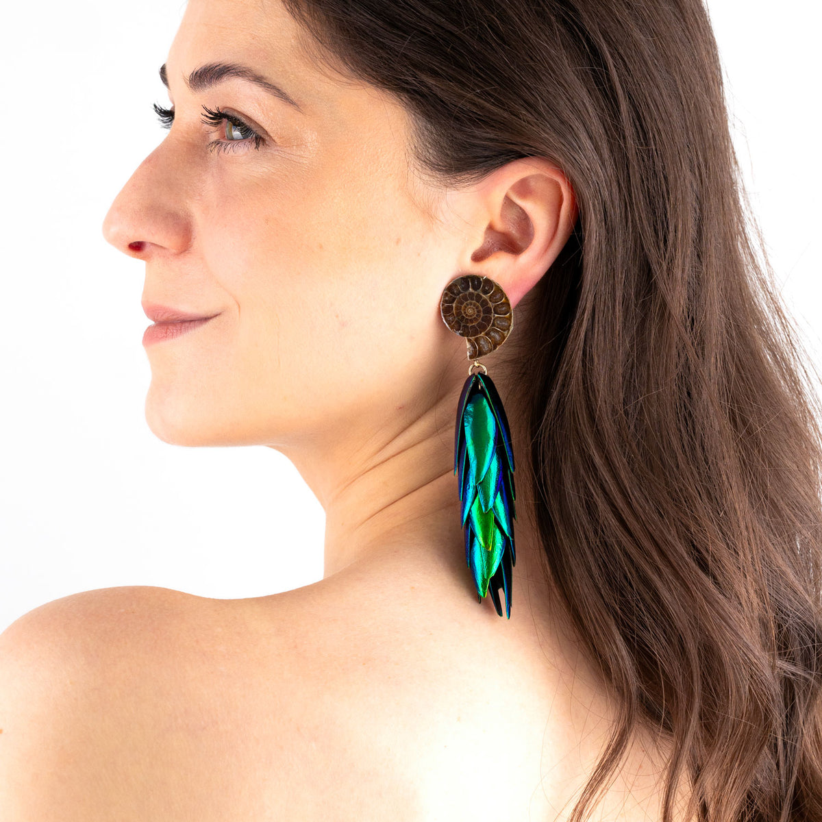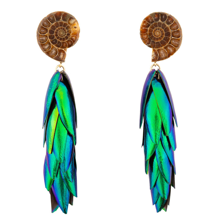 These earrings are handmade with recycled 14k gold-filled material, ethically sourced natural beetle wings, and ammonite fossils. They are finished with sterling silver gold-plated ear clips.