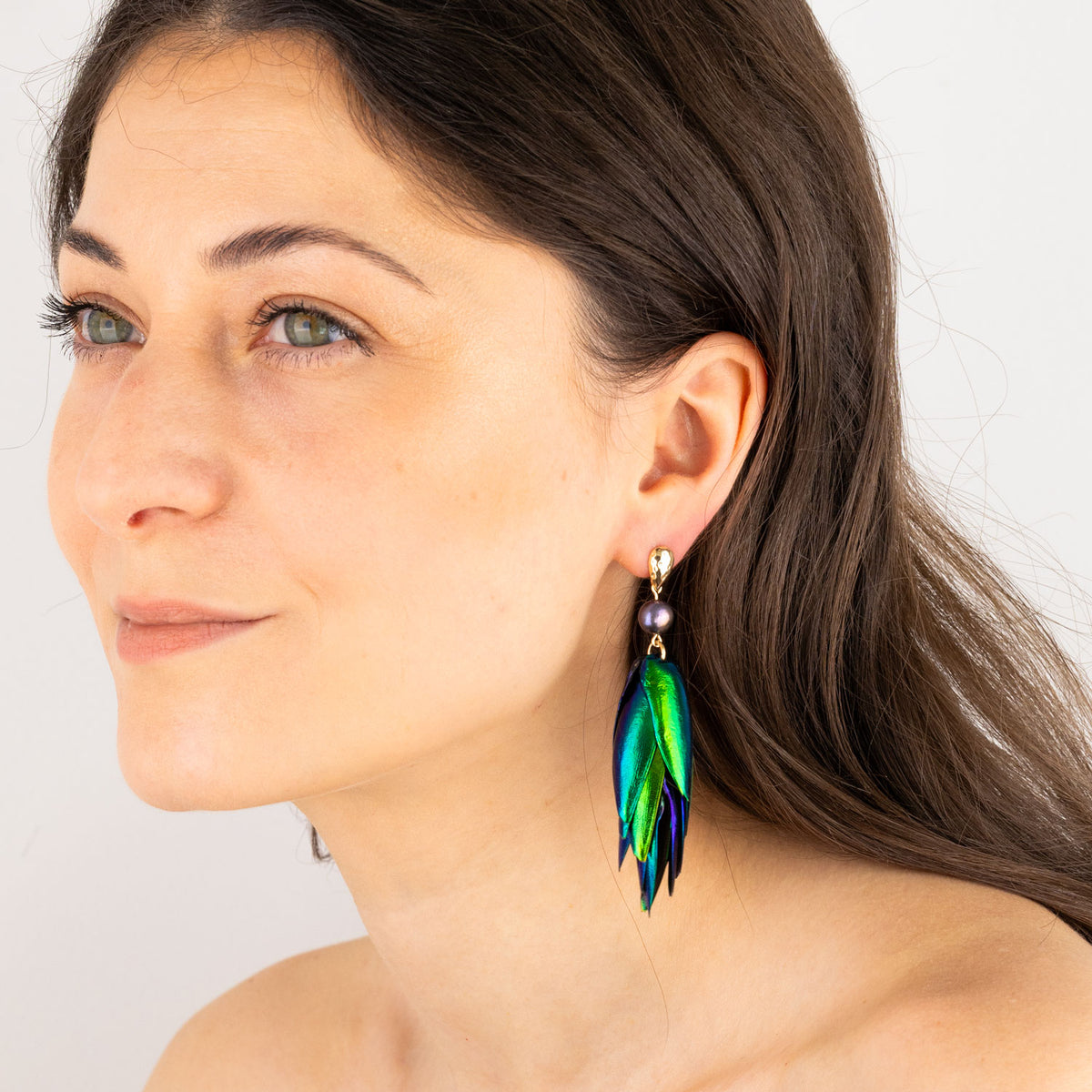 These Beetle Wings Metallic Green Earrings with Peacock Freshwater Pearls by Oanasavu.creations are a unique and striking design featuring approximately 20 ethically sourced scarab wings per piece. The wings have a shiny green shade with hints of copper and gold. These earrings, which are extremely light and durable, feature peacock freshwater pearls and are a testament to artistry and ethical sourcing.