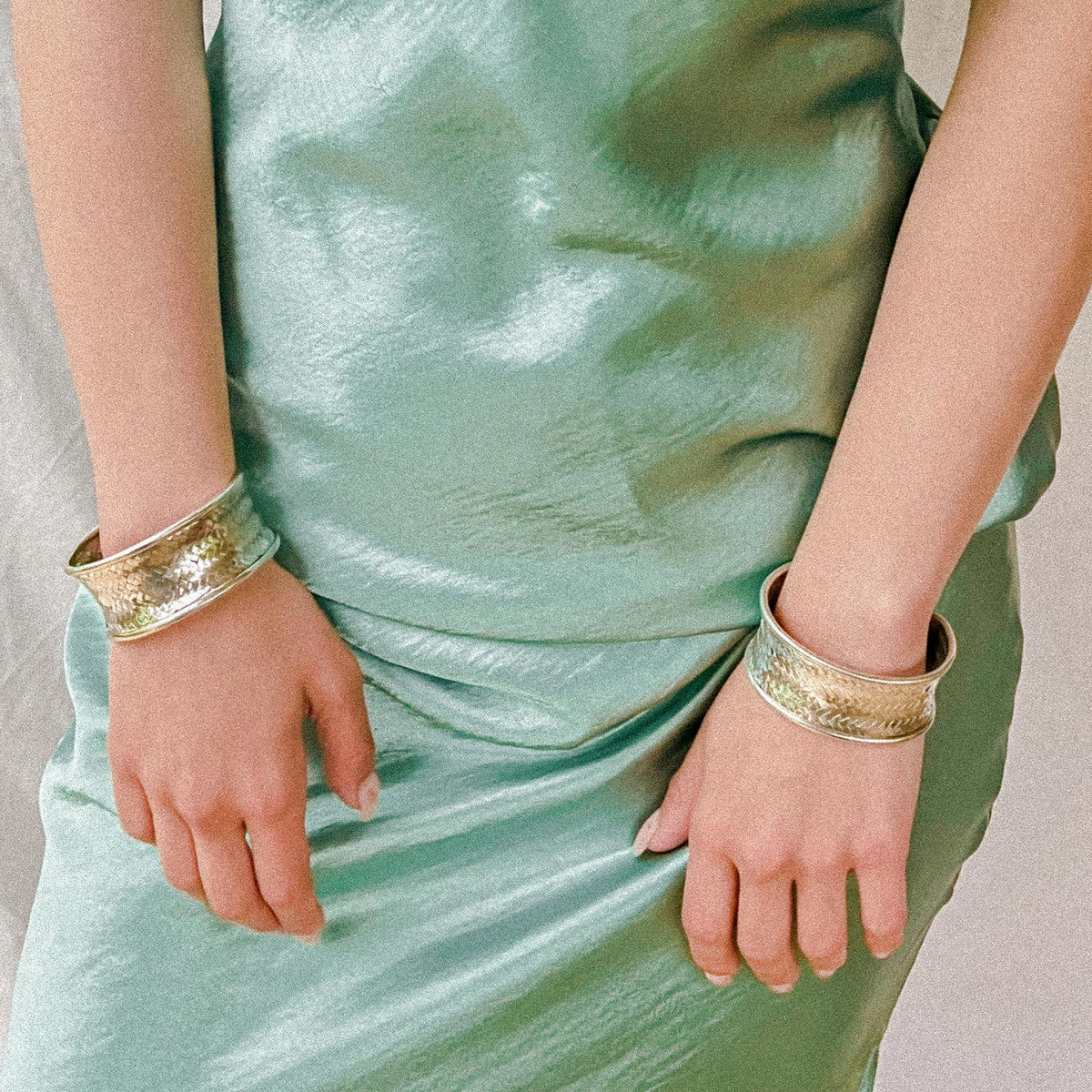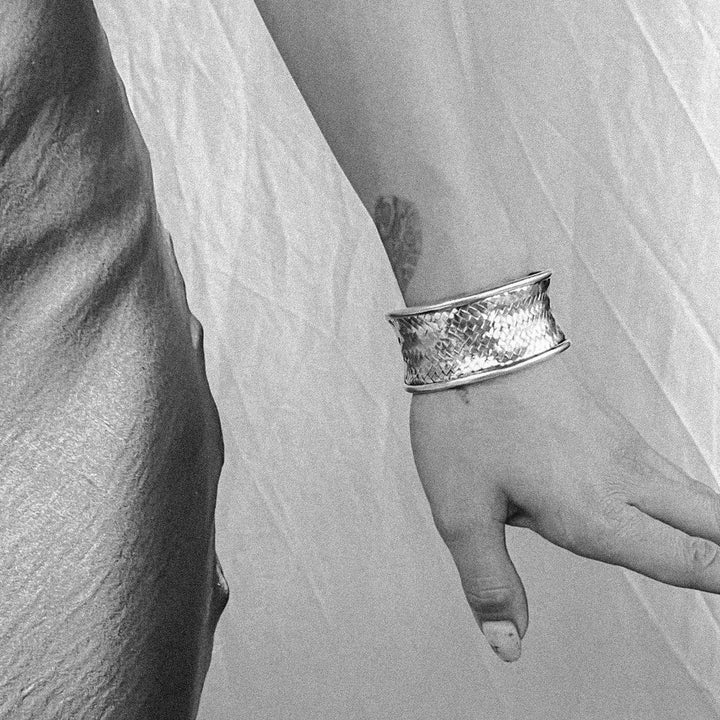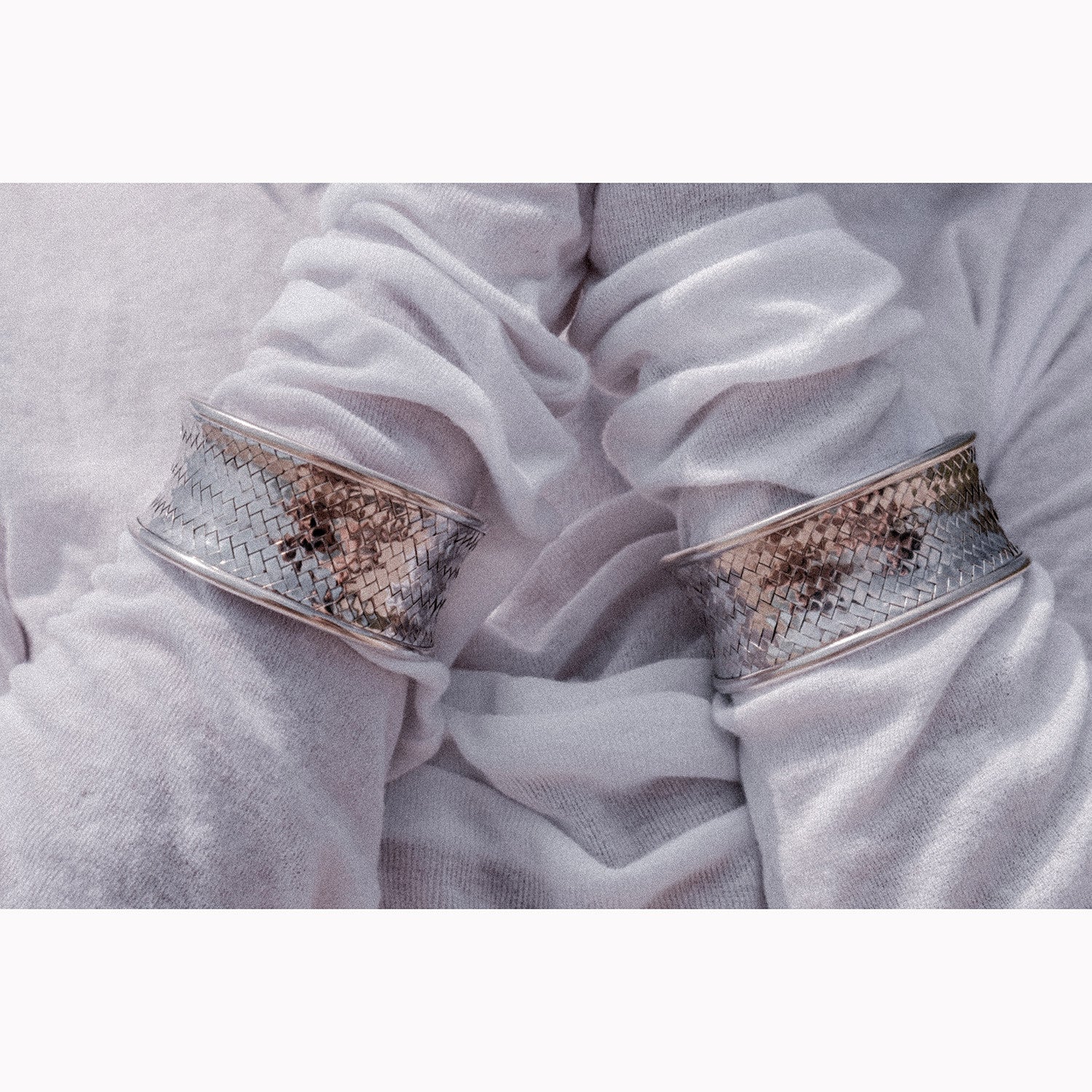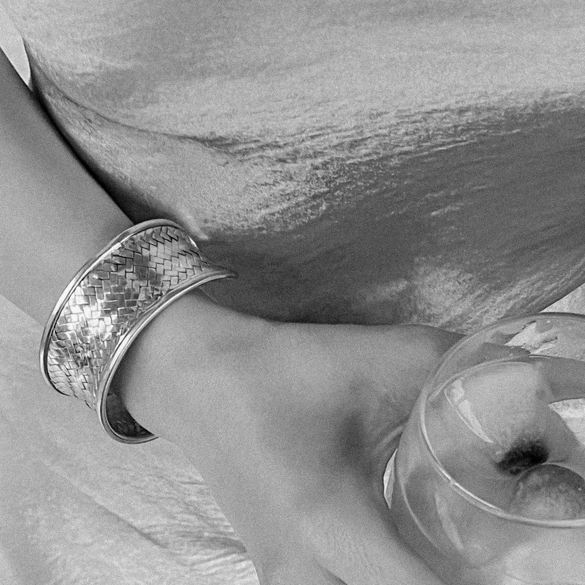 This cuff bracelet is made of 925 Sterling Silver. It has a unique hand-made and interwoven design.