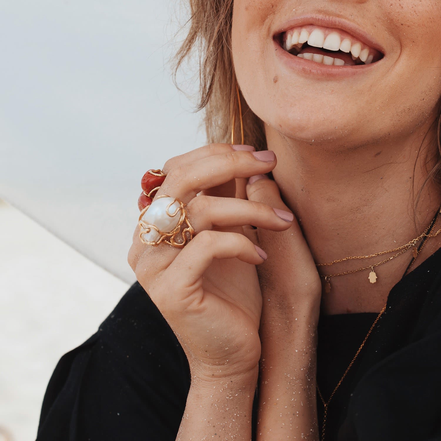This hand-crafted ring is made from 925 sterling silver with gold vermeil plating and features a unique baroque freshwater pearl. The ring is adjustable.