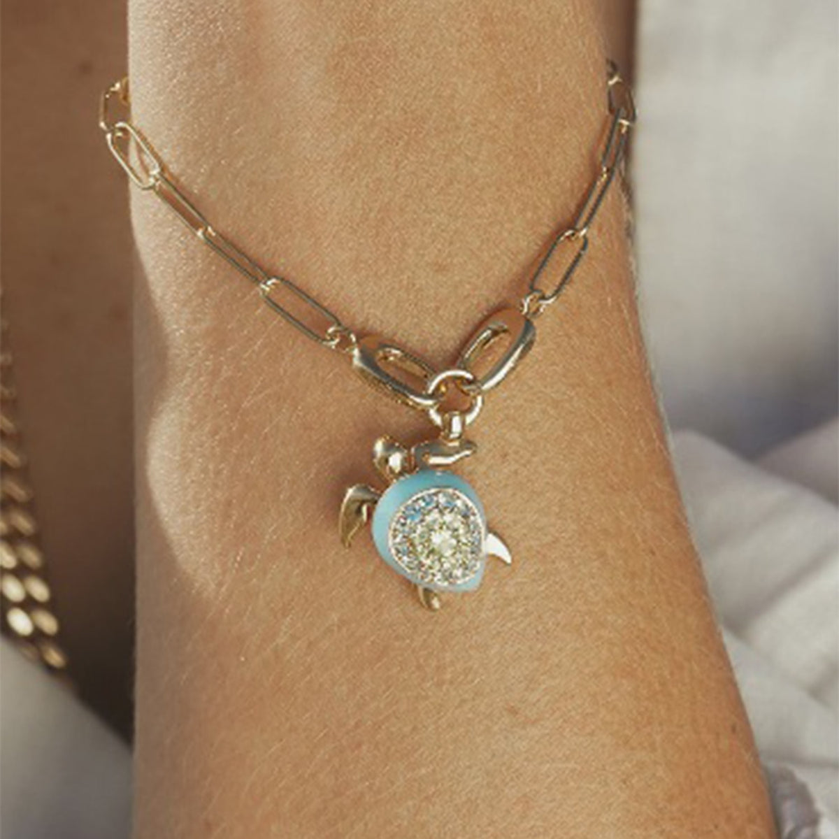 The Gentle Turtle Charm by Oni Fine Jewelry is a meaningful and treasured accessory. It beautifully fuses soothing green peridot and blue topaz, combining the symbolism of wisdom, longevity, and luck. Its unique twist-and-lock mechanism ensures it always hangs in the right direction on any piece of jewelry. This version is finished in gold.