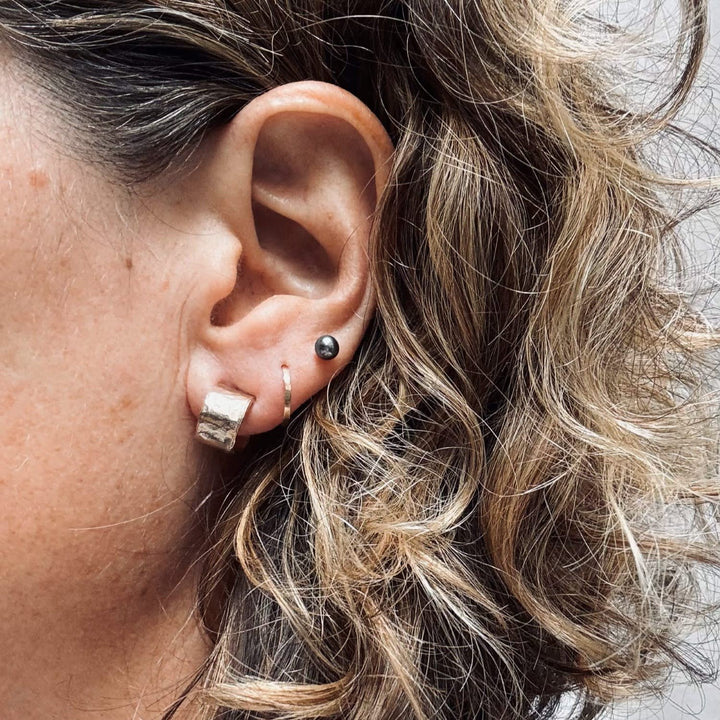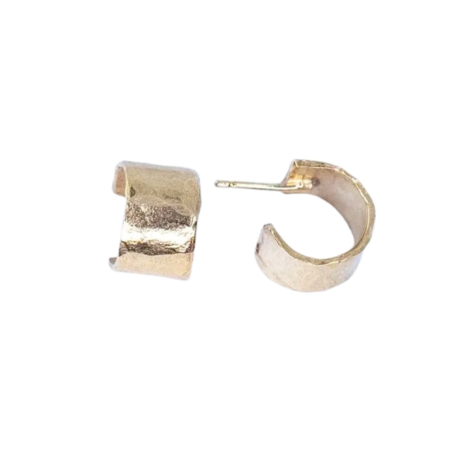 The Brutalist Circular Huggie is an interesting everyday statement piece. Inspired by brutalist architecture, these small but chunky huggie hoops have an organic, hammered surface. They are made from 14ct filled gold, a thick and durable layer of gold bonded to brass, ensuring a long life.