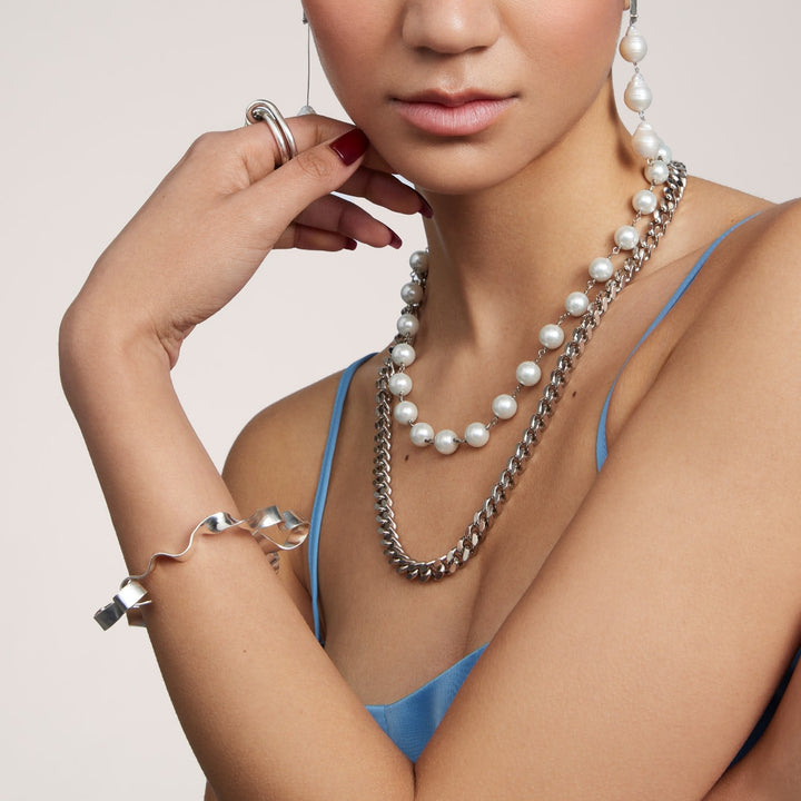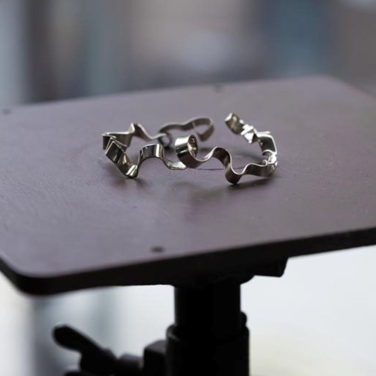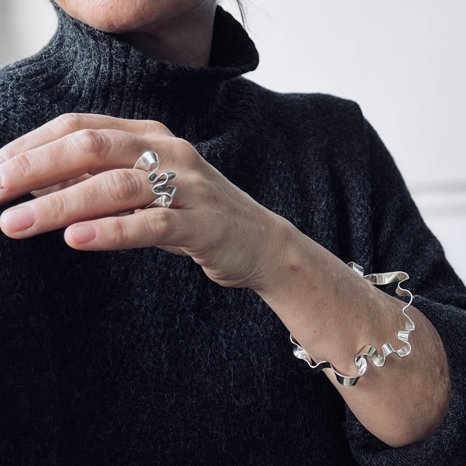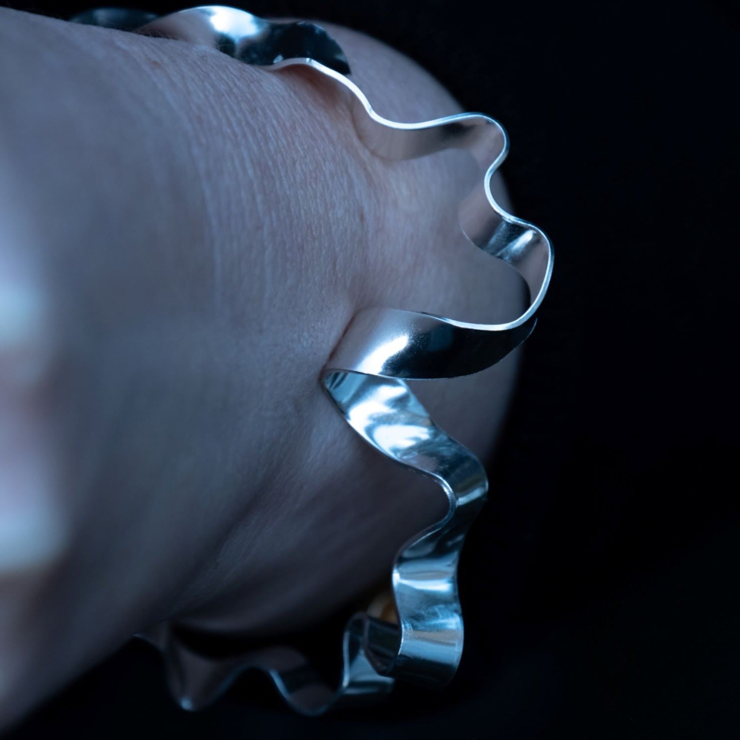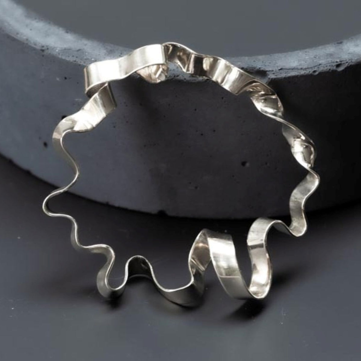 The Ribbon Bracelet In Silver is an original handmade statement piece. This bracelet is made of 100% recycled 925 sterling silver and features an unfurling ribbon that swirls and dips in the air. It is fun and easy to wear, and can be bent to fit your wrist perfectly.