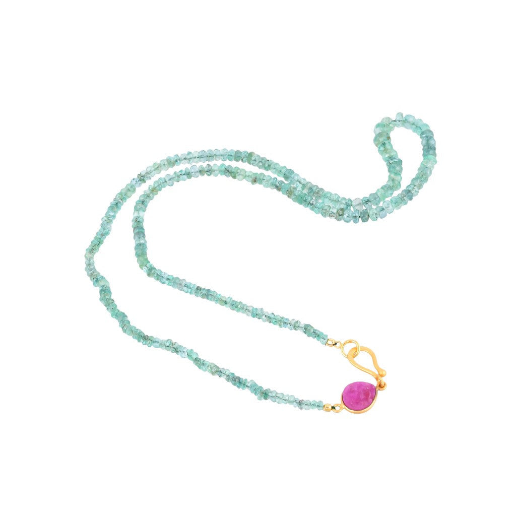 Faceted Emerald Strand With A Raw Cut Ruby Clasp