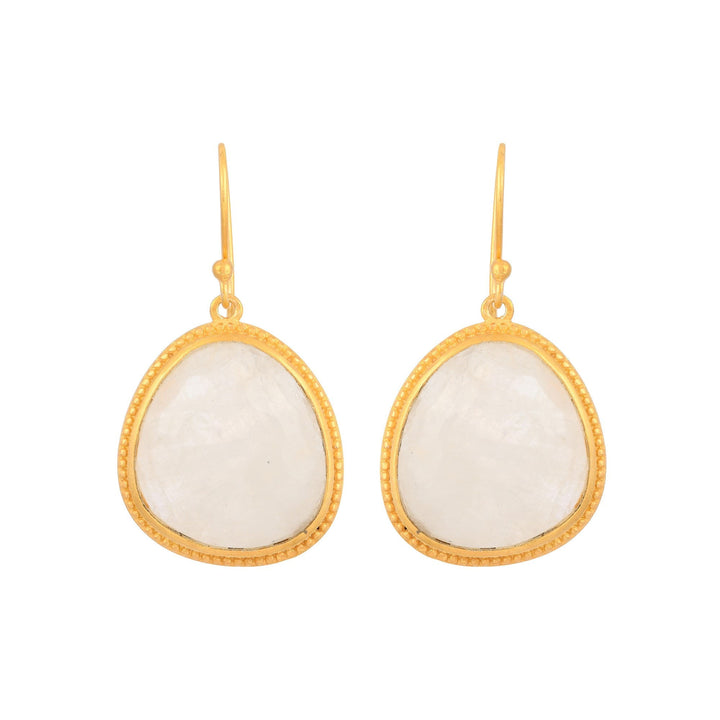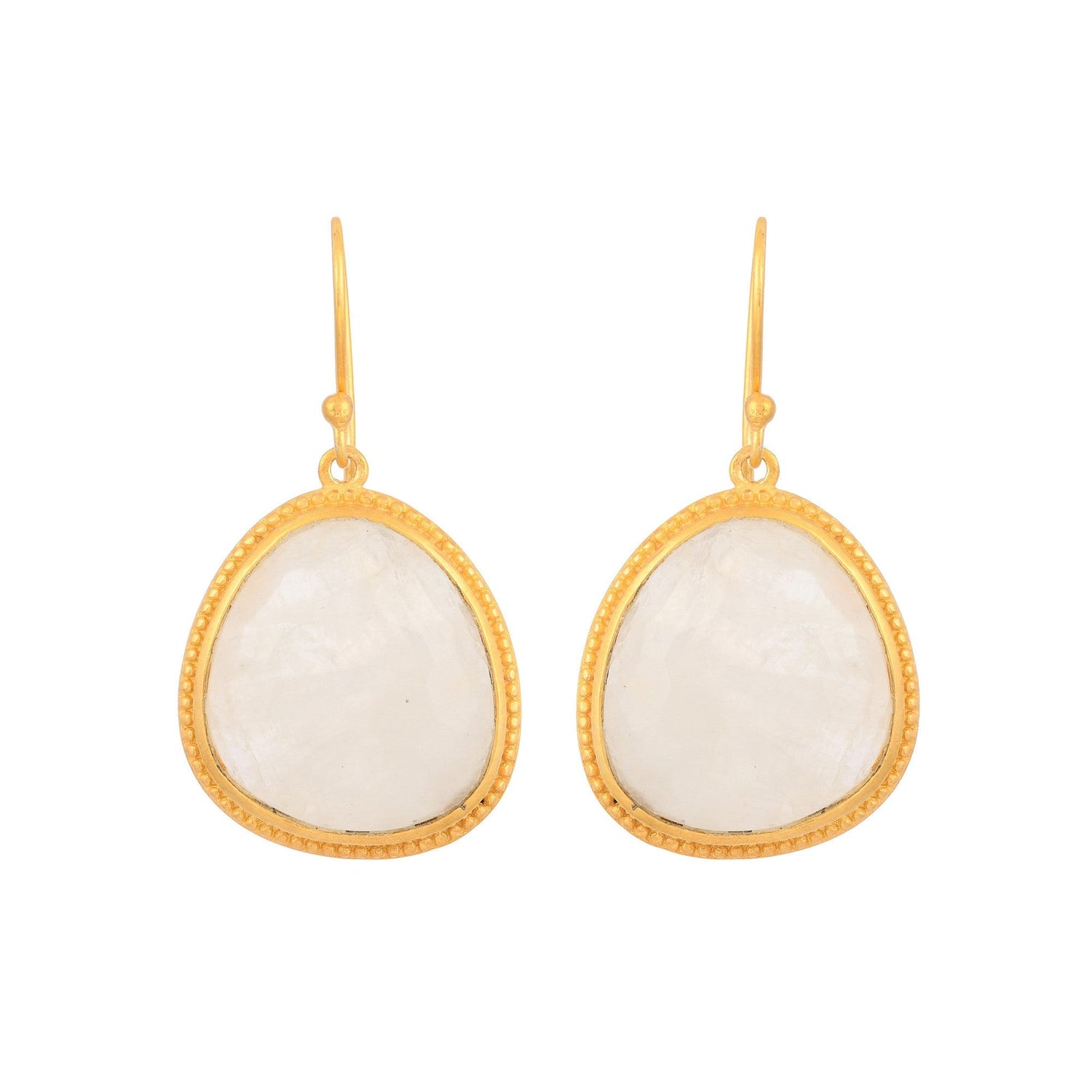 These Faceted Drops In Luminous Rainbow Moonstone by Opium Jewels are a pair of beautiful dangle earrings. They feature faceted rose-cut rainbow moonstones with a flashing blue fire in the stone. The earrings are set in silver and plated in 18 carat gold vermeil (3 microns), giving them a beautiful and luminous look.