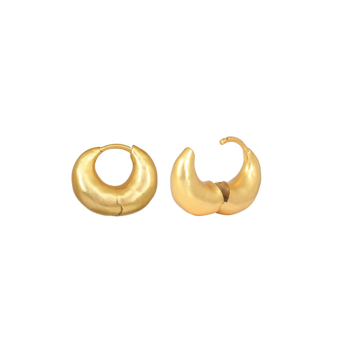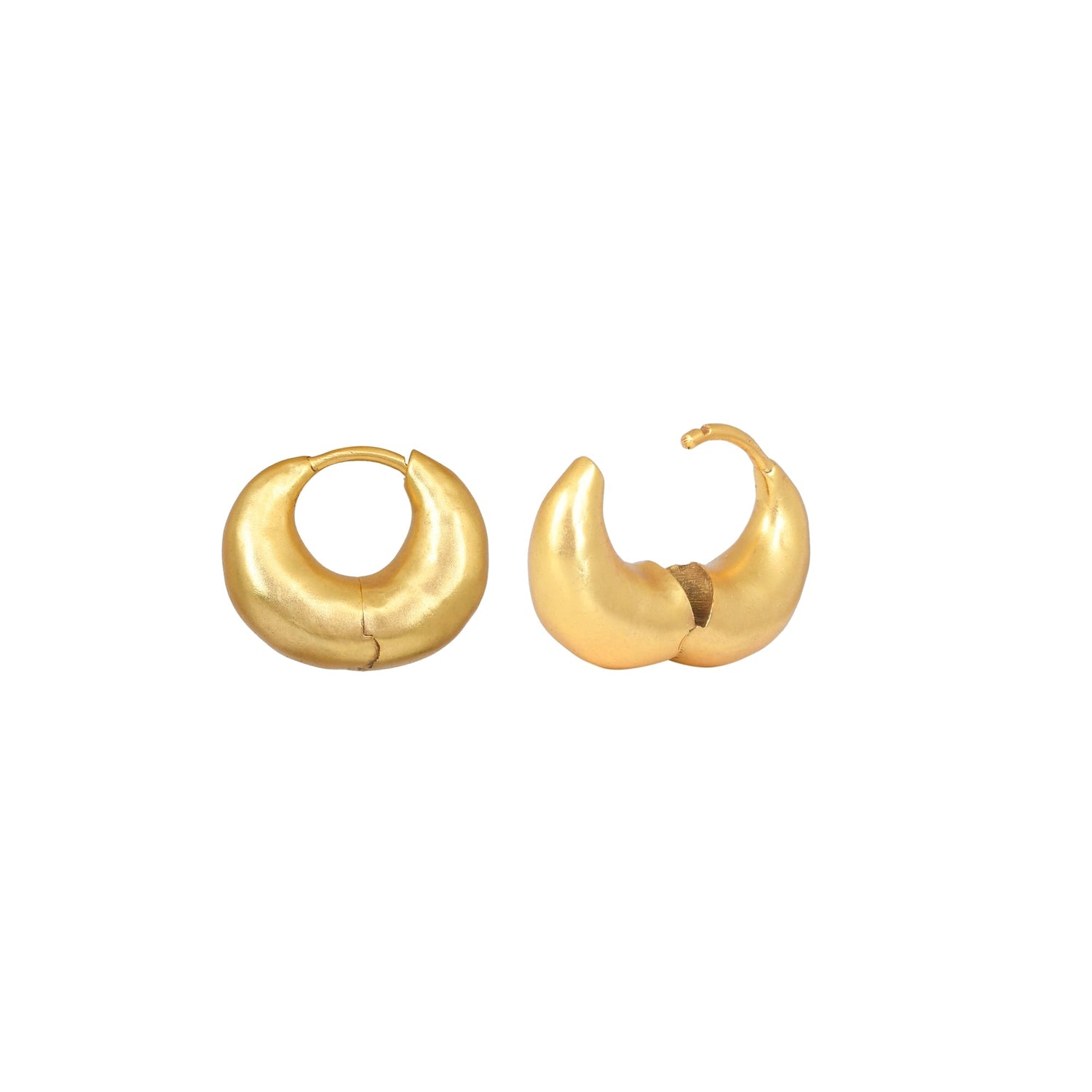 These Gold Crescent Hoops by Opium Jewels are a new addition to the collection that is very much in vogue. Plated in 18-karat matt gold vermeil, the hoops have a secure 'clicking' open and close mechanism. Their unique shape and finish make them a stylish and modern accessory.