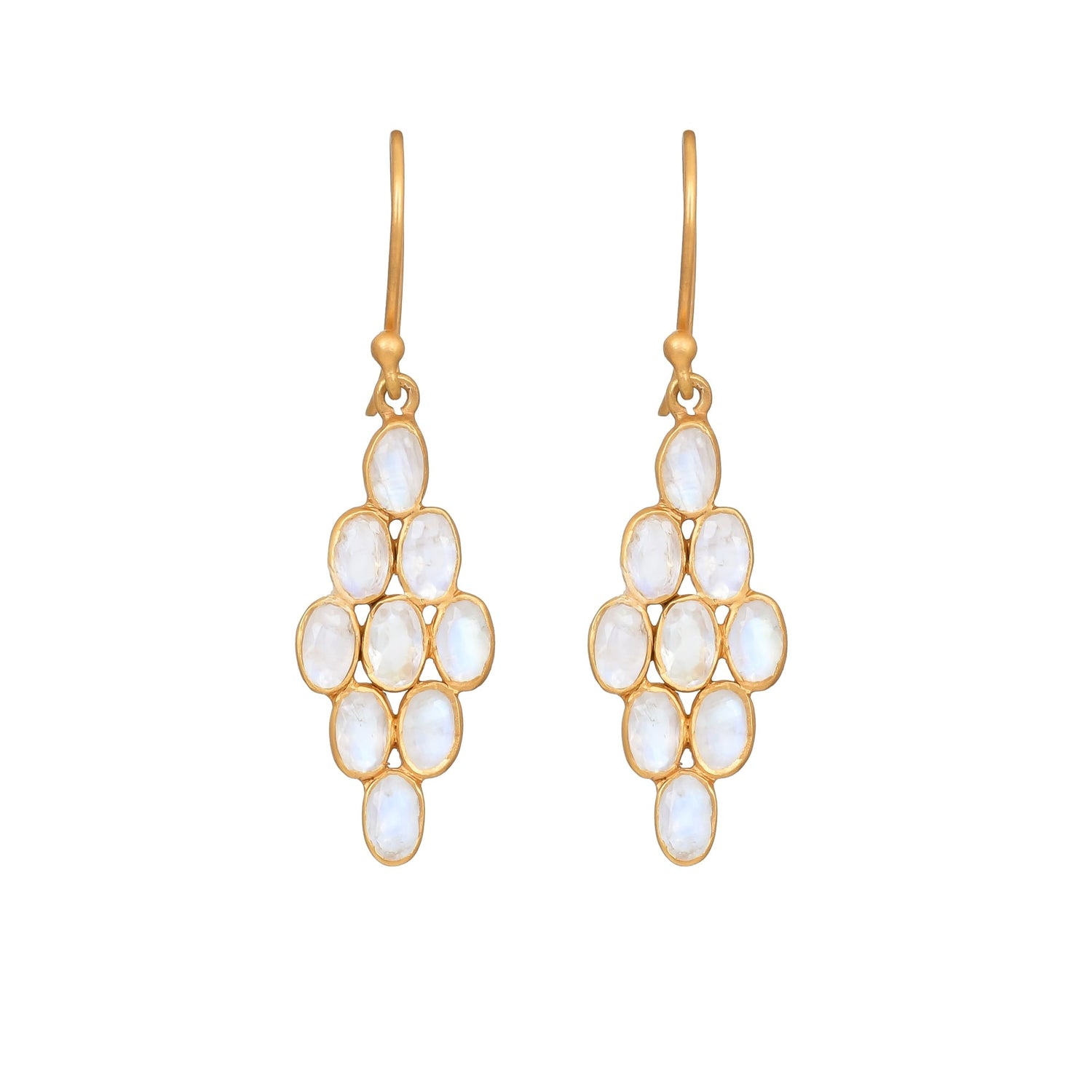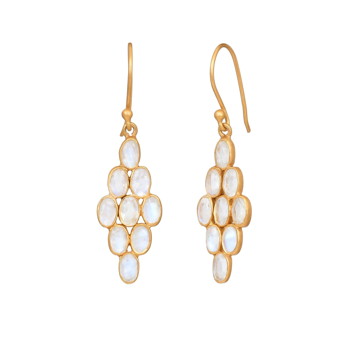 The Night Star Jali Drops - Rainbow Moonstones by Opium Jewels are inspired by the midnight sky in the Indian desert. The stunning drops feature fine-quality rainbow moonstones, set in 18-karat gold-plated vermeil on silver. These earrings are a beautiful and celestial accessory perfect for a special night out.