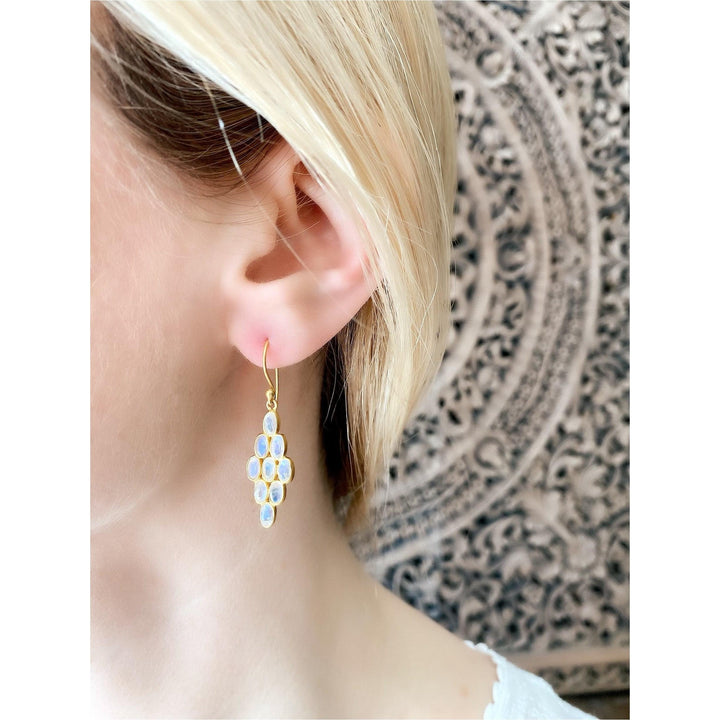 These earrings are 18-karat gold-plated vermeil on silver (3 microns thick). They feature fine-quality rainbow moonstone stones. The drop length is 2.5 cm plus the ear wire, and the earring width is 1.5 cm.