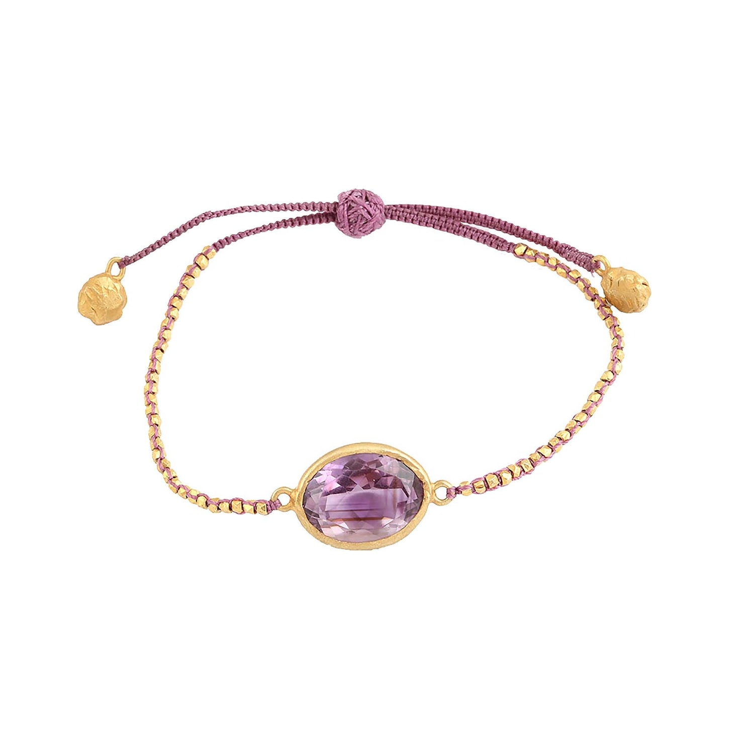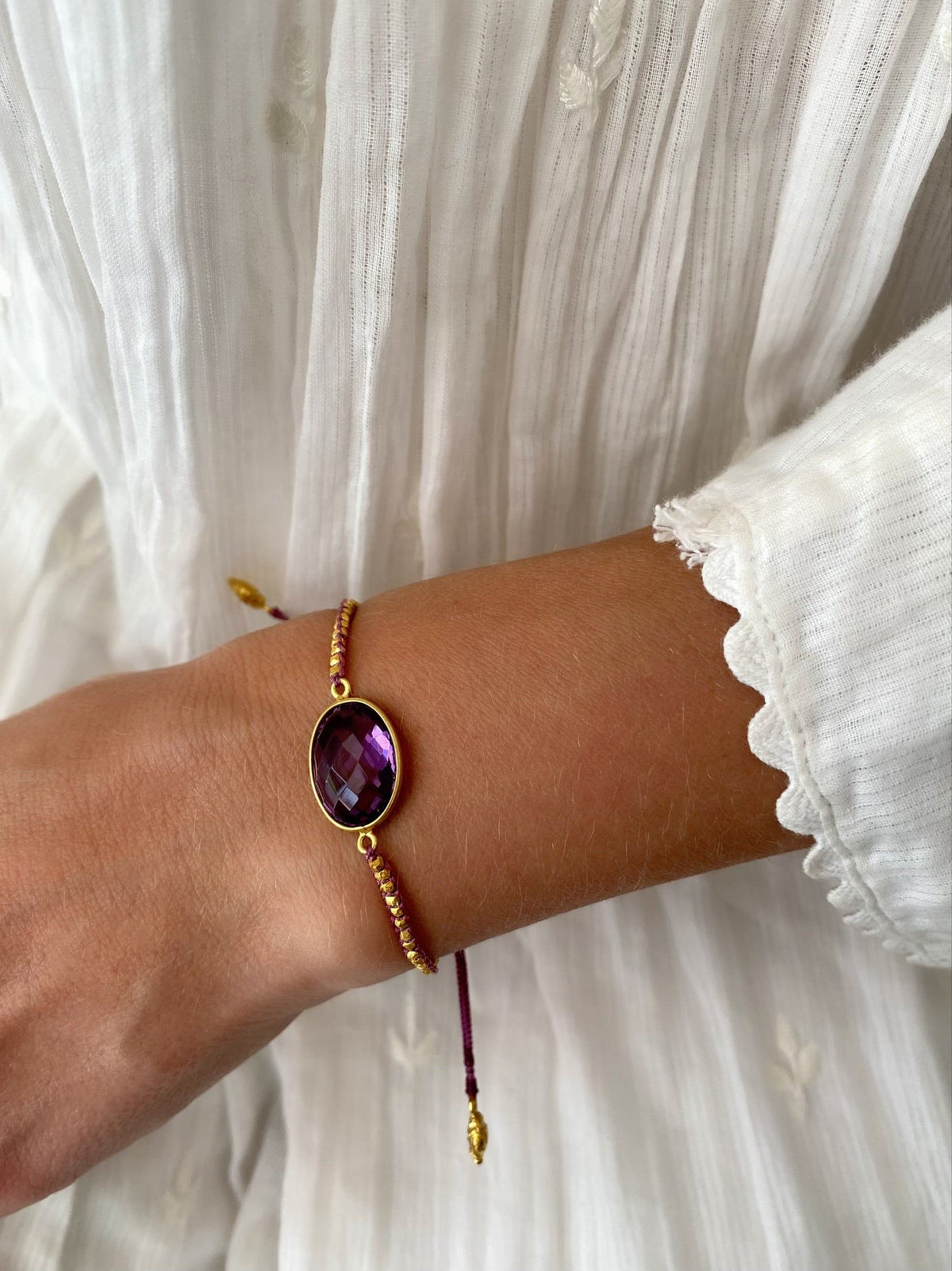 This bracelet is crafted from 18k gold vermeil over silver, with a 3-micron thickness. It features amethyst stones and is woven with a lavender-colored thread. The bracelet is adjustable and the stones are 1 cm wide.