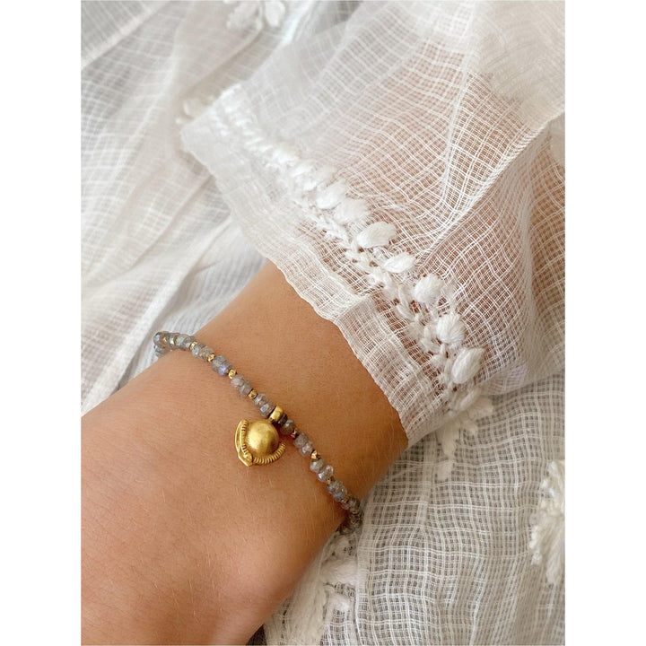 The Vintage Amulet Bracelet - Gold Beads & Labradorite by Opium Jewels is a beautiful beaded bracelet with a vintage amulet. It features Labradorite stones and gold beads, threaded on jewelry elastic. The vintage amulet is a unique piece made of silver and plated in 18 carat gold vermeil, making this bracelet perfect for wearing alone or stacking with others.