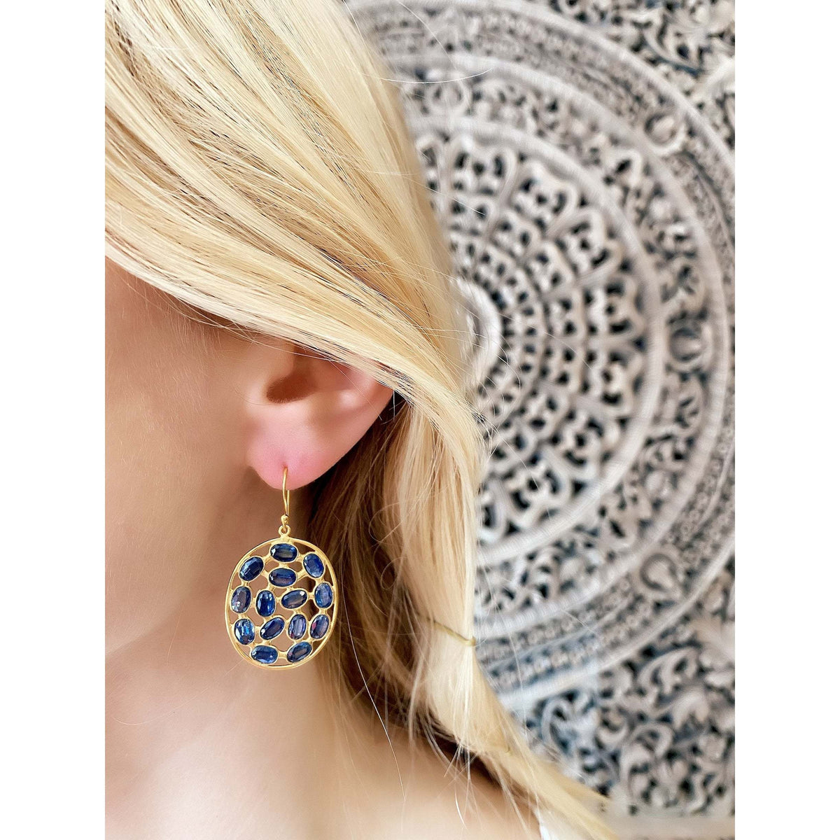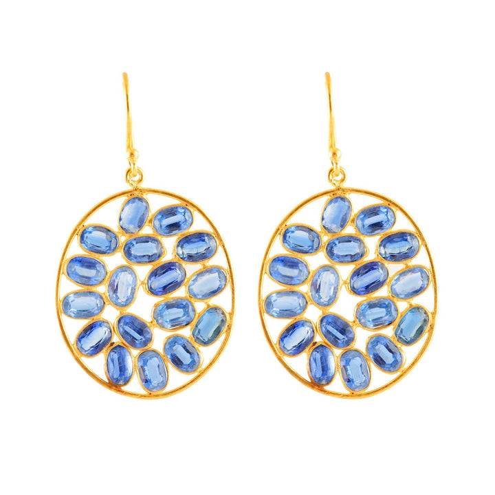 The Oval Jali Cocktail Drops - Kyanite by Opium Jewels are designed to give an 'understated' look to a 'statement' earring. These dangle earrings are set with stones in a mosaic style. They are made of silver and plated in 18 carat gold vermeil with a 3-micron thickness. The stones are Kyanite.