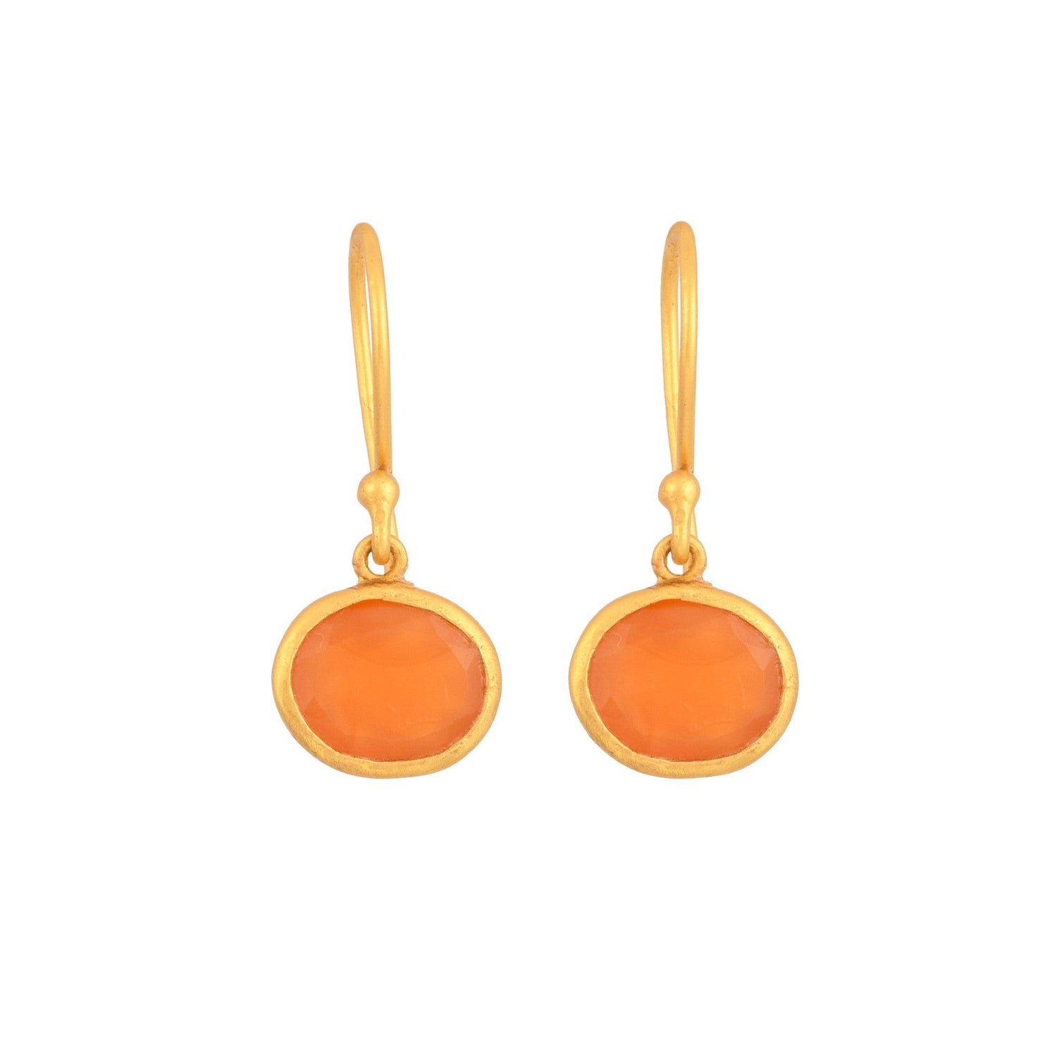 These dangle earrings feature cabochon carnelian stones set in silver and plated with 3 microns of 18-carat gold vermeil. The height is 3cm (including wire), and the width is 1.5cm.