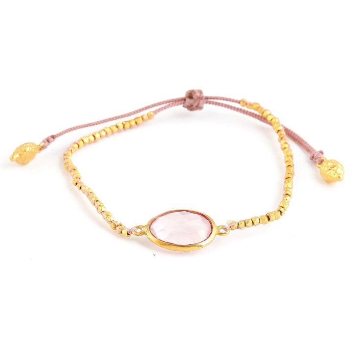 This adjustable bracelet features rose quartz, handmade gold-plated beads, and a soft pink thread. The jewelry is set in silver and plated in 18-carat gold vermeil, equivalent to 3 microns of gold. The total length is 20 cm, and the stone width is 1 cm.