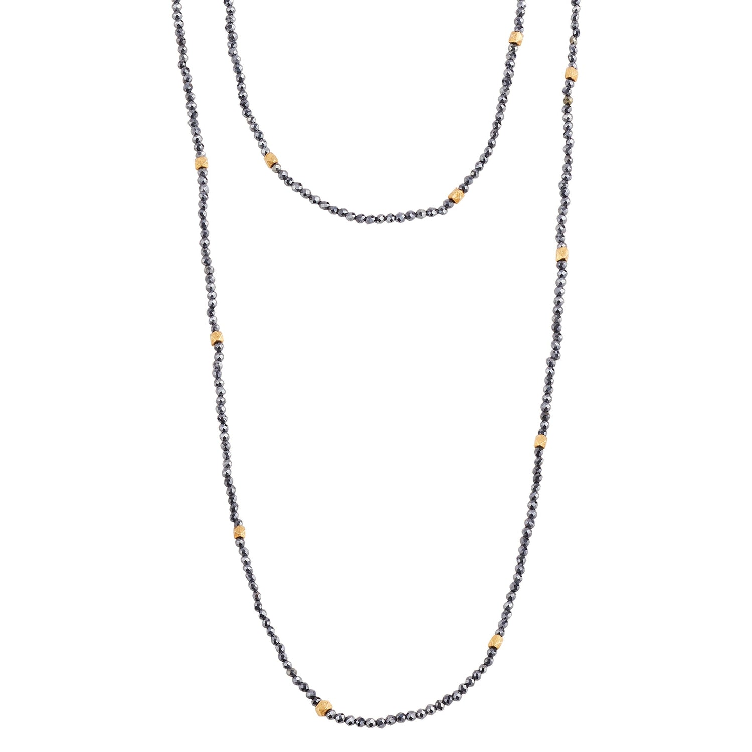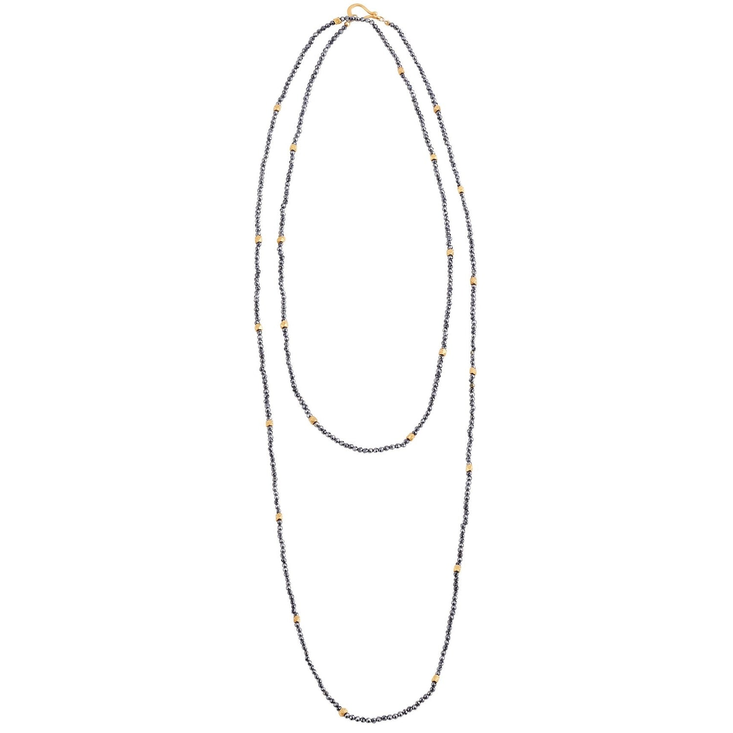 This necklace is set in silver with a 2.5-micron 18-carat gold vermeil plating. It features faceted black spinel stones and has a length of 106cm with a single S hook clasp.