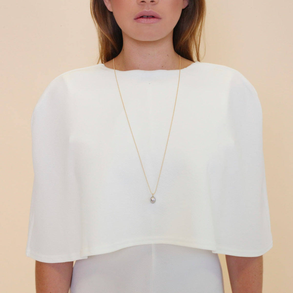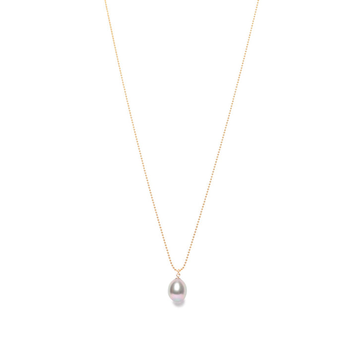 This necklace features a grey freshwater drop pearl pendant on a 32-inch 14-karat gold-filled ball chain. It is packaged in an ORA gift box.