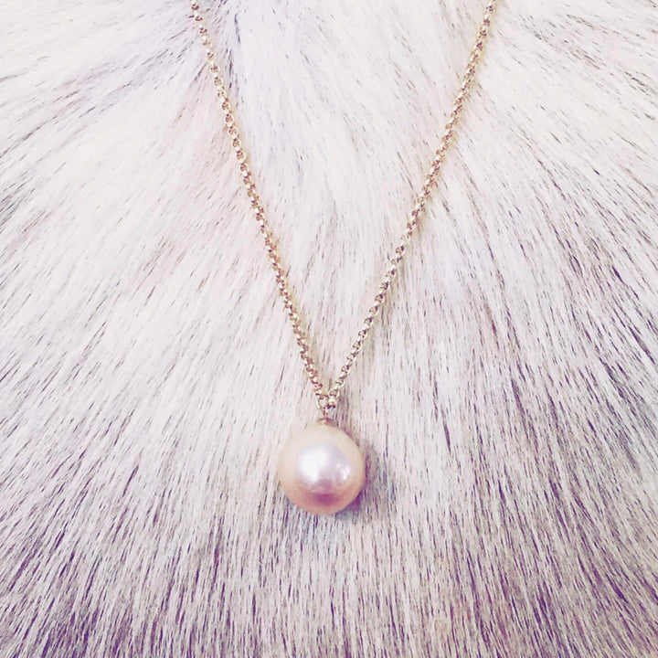 This necklace features an XXL pinky gold freshwater pearl pendant on a 35-inch 14ct gold-filled chain. It comes in a beautiful ORA gift box.
