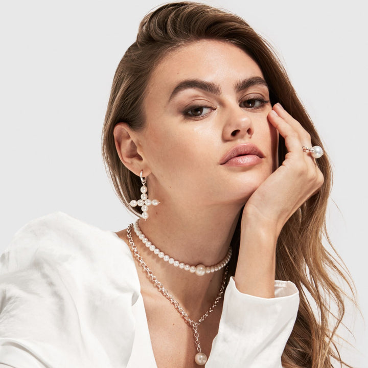 These Aelia Cross Pearl Hoop Earrings by Ora Pearls offer a unique and spiritual take on classic pearls. The elegant freshwater pearl cross is set within a sterling silver hoop, creating a beautiful blend of modern design and timeless symbolism. Each pair is handcrafted and one-of-a-kind, celebrating the individuality of the organic pearls. These earrings are perfect for adding a touch of meaningful grace and refined style to any ensemble.