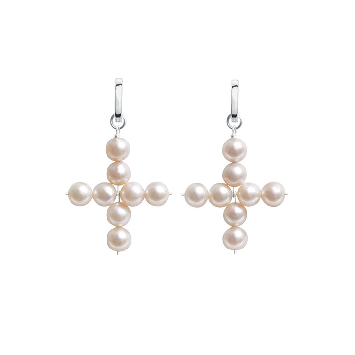 These handmade earrings are made from 925 sterling silver and feature a freshwater pearl cross. Each pearl is unique and may vary slightly in size, shape, and color.