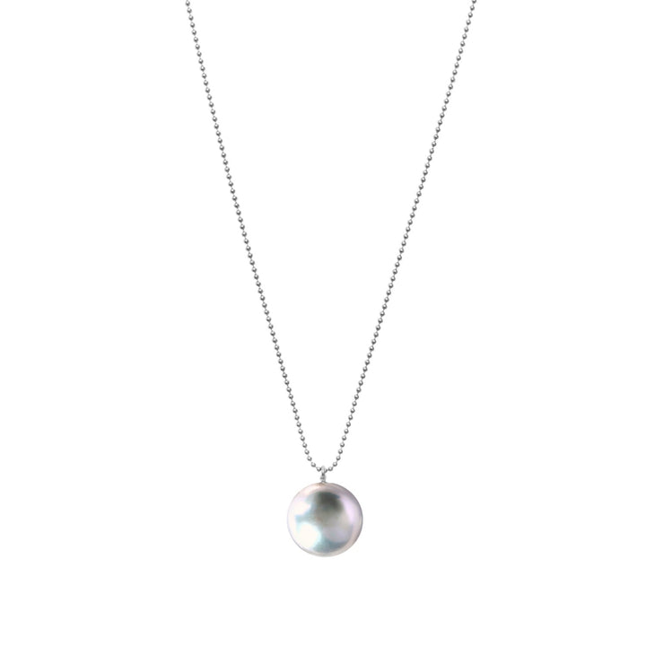 The Orbis Grey Pearl Pendant Necklace by Ora Pearls is a contemporary and elegant piece. It features a magnificent XXL grey freshwater pearl pendant on a long 32-inch sterling silver ball chain. The unique, organic pearl and the clean design make this necklace a stylish statement piece that stands out. Each piece is handcrafted and one-of-a-kind, reflecting the unique beauty of nature.
