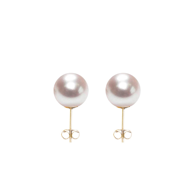 These stud earrings are made of 9ct gold and feature medium-sized round white freshwater pearls.