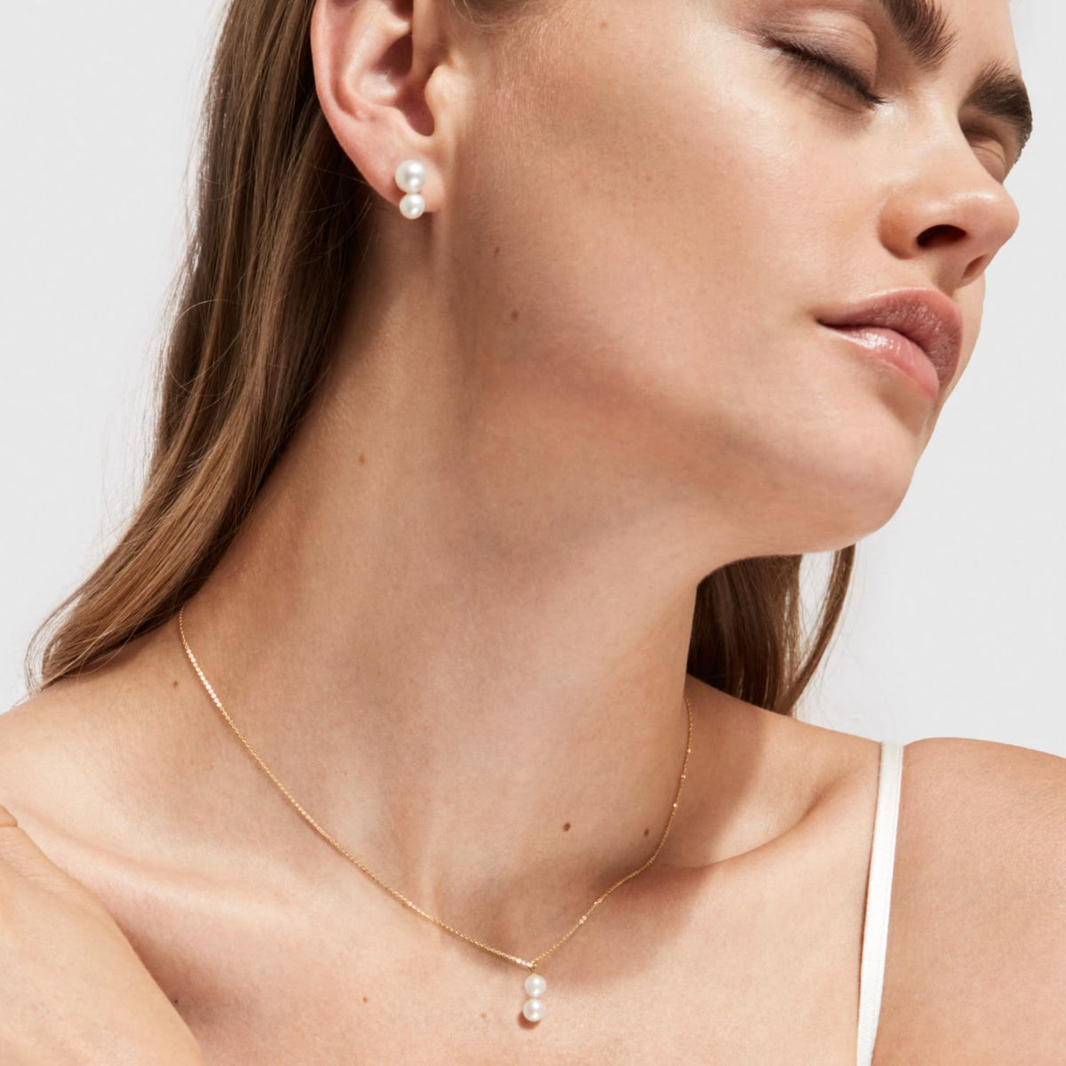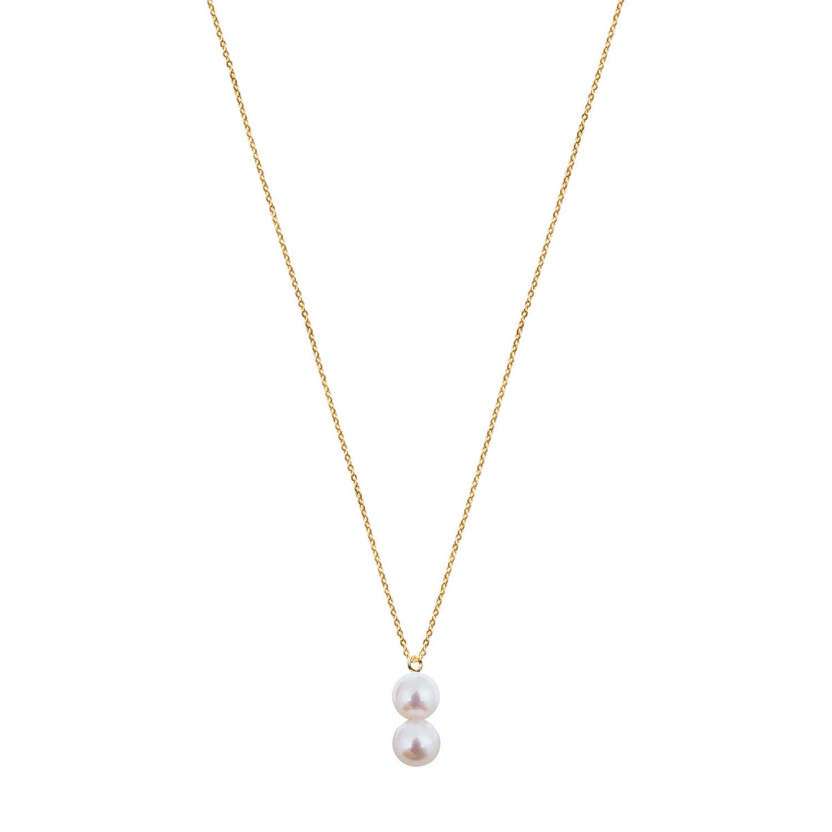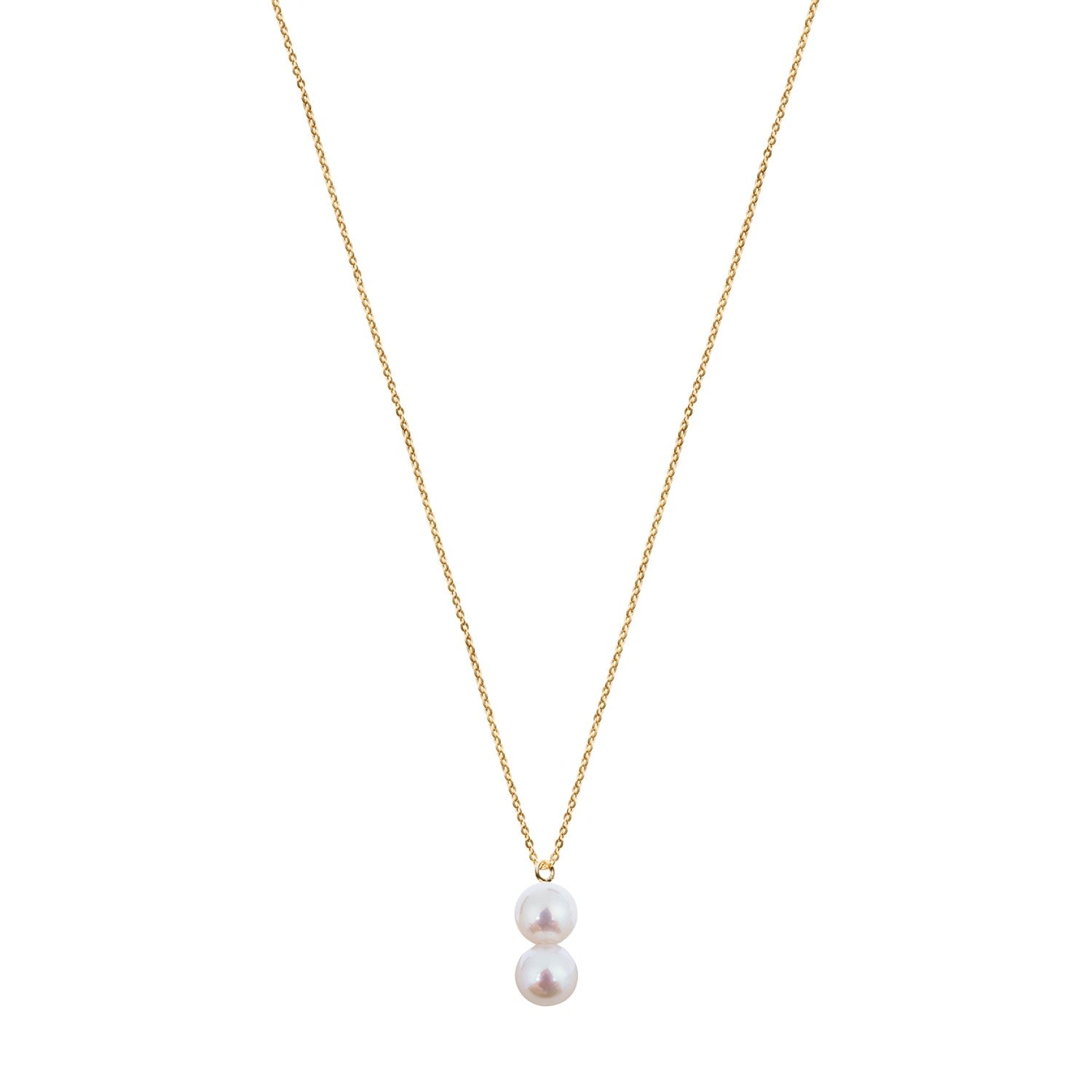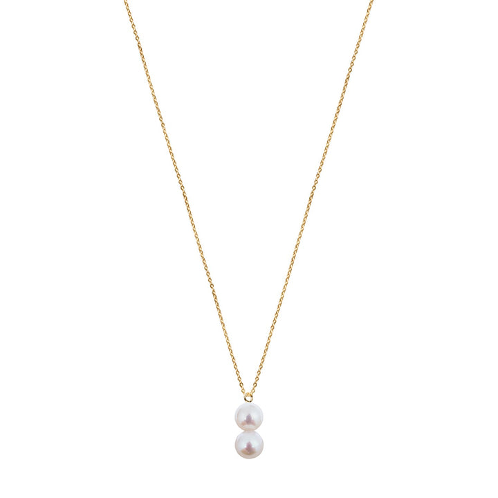 This necklace is crafted from solid 9ct yellow gold and features two freshwater pearls. The pearls are organic and may vary slightly in size, shape, and color.