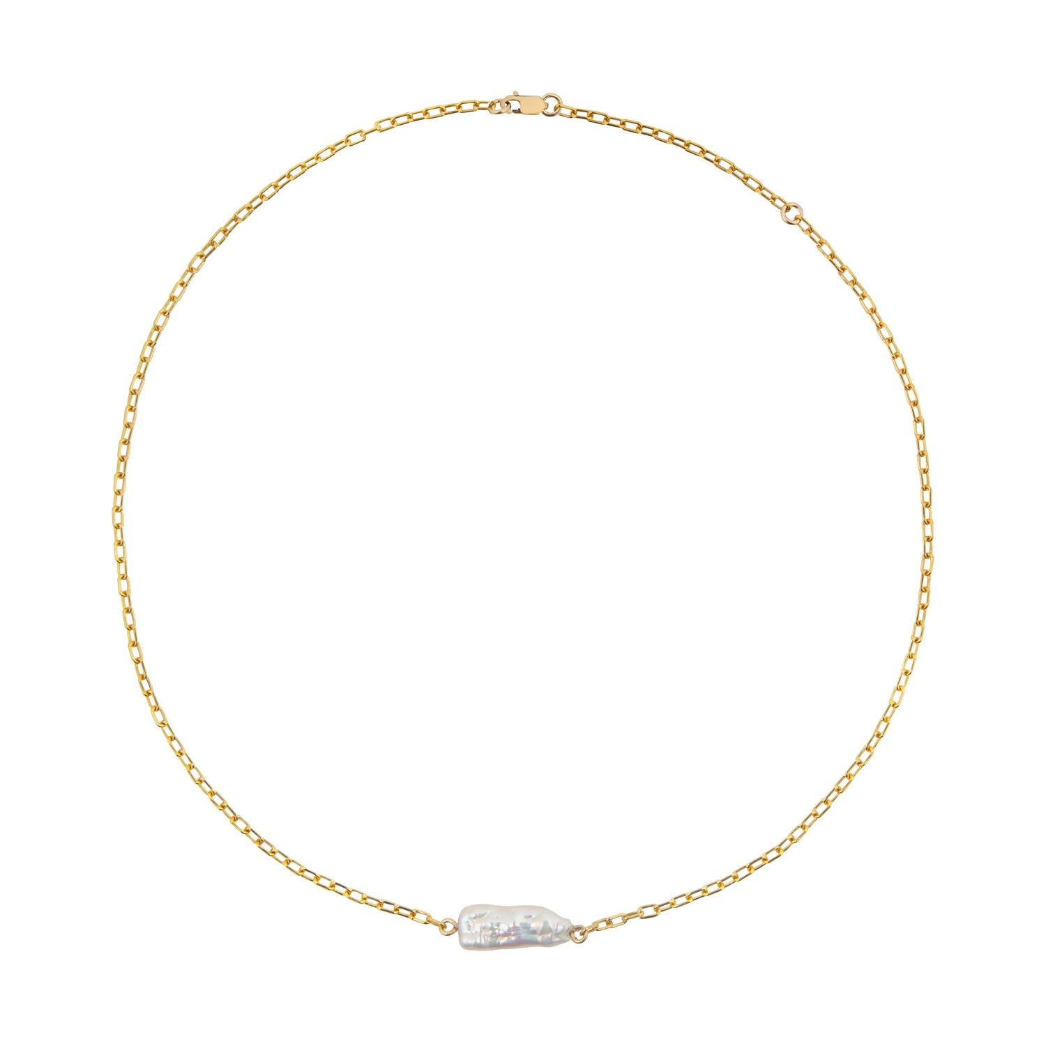 This necklace is handcrafted with a 14ct gold-filled square chain and features a large white baroque pearl pendant.