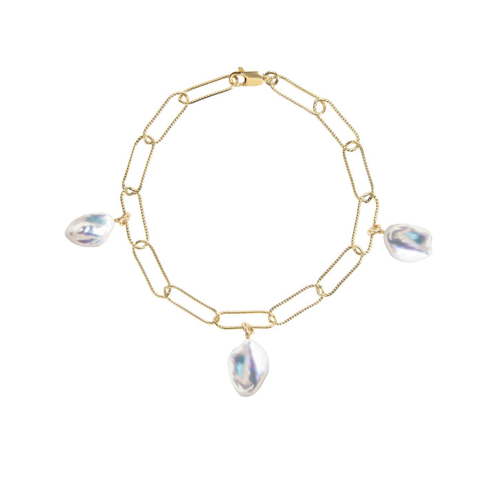 This bracelet is handcrafted with a 14ct gold-filled large link chain and features keshi pearl charms.