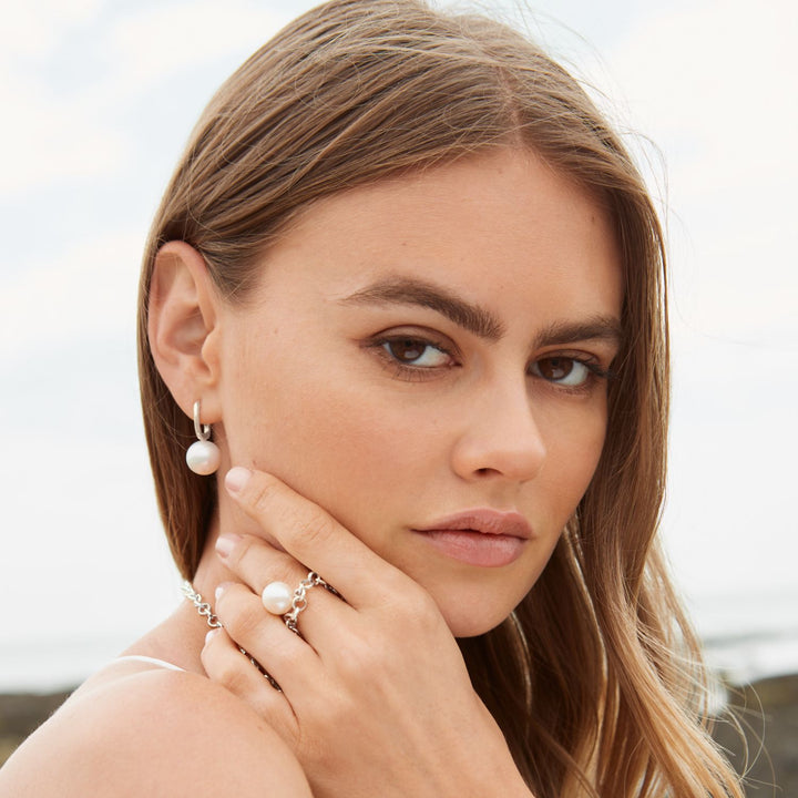 These Aetis X Large Pearl Hoop Earrings by Ora Pearls are a dramatic and elegant statement piece. They feature stunning, extra-large freshwater pearls suspended from classic hoops. Each pair is handcrafted, ensuring that every piece is unique. The impressive size of the pearls and the classic hoop design create a luxurious and eye-catching look, perfect for adding a touch of sophisticated glamour to any outfit.