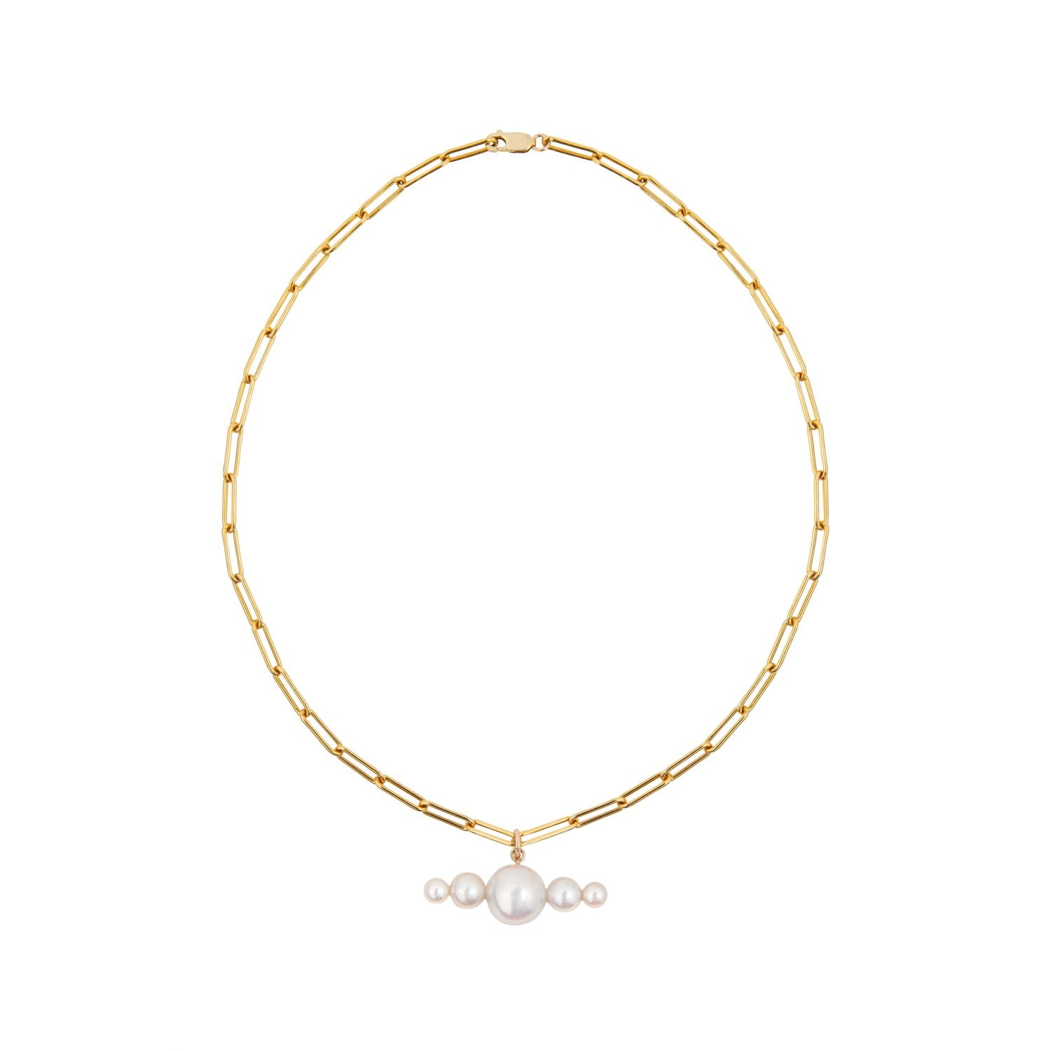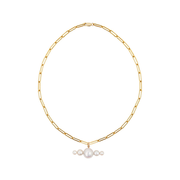 This chain necklace is made with 14ct gold-filled material. It has a removable pendant with freshwater pearls.