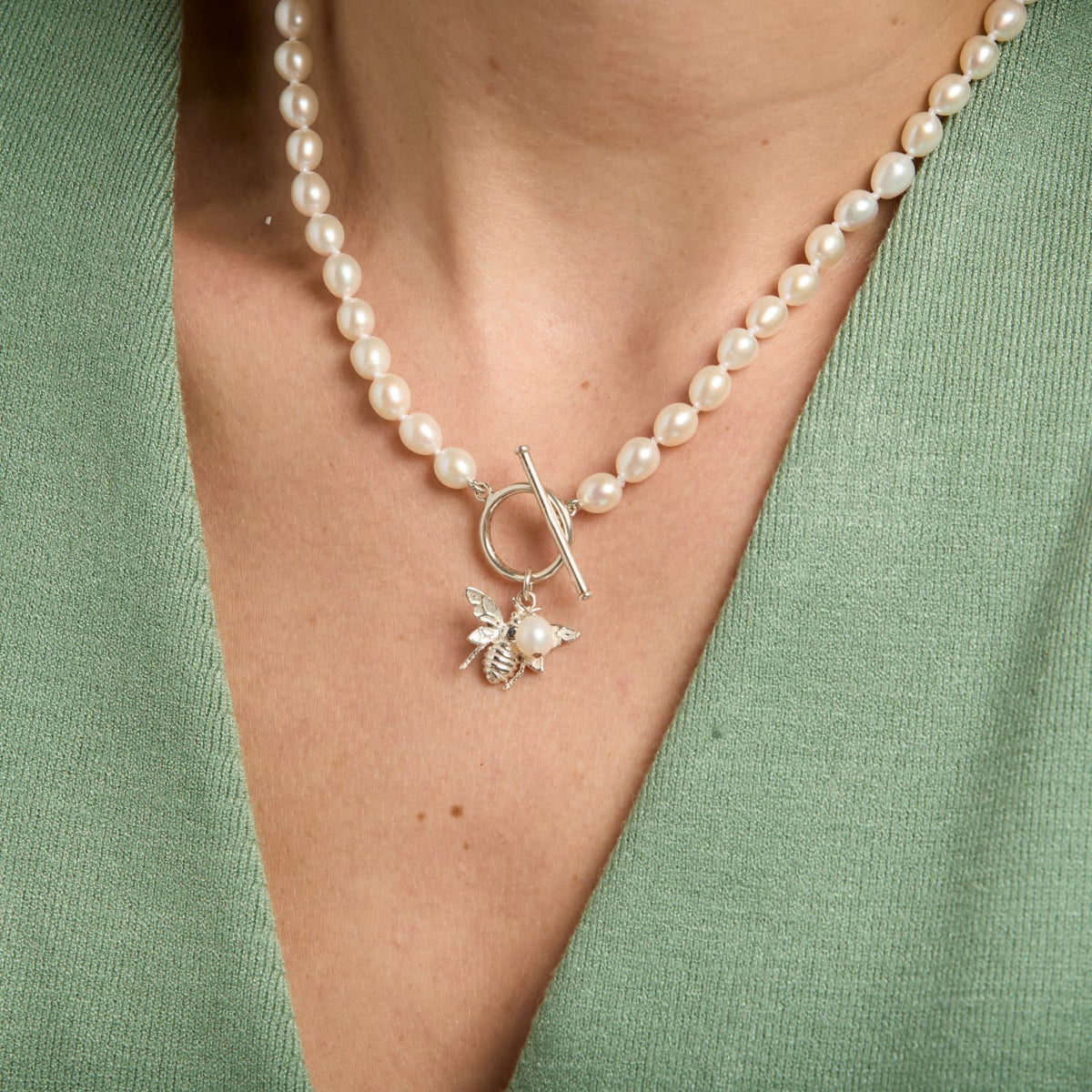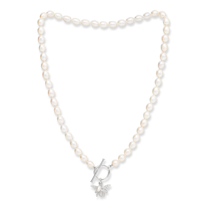 This necklace features a single strand of oval cultured freshwater pearls with a sterling silver toggle clasp and a sterling silver bumble bee charm.