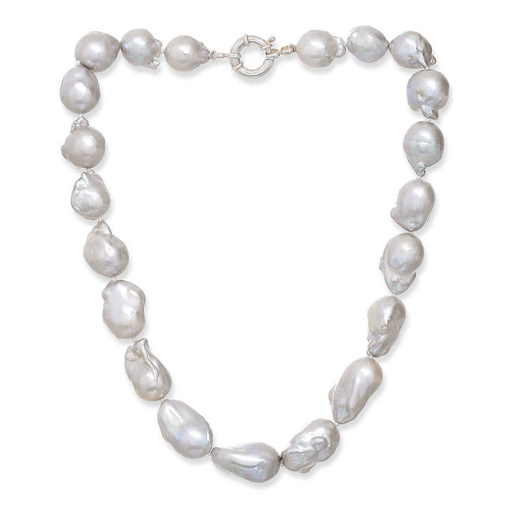 This pearl necklace features large, silver-grey cultured freshwater "fireball" baroque pearls. The necklace is approximately 18 inches long and has a sterling silver spring clasp.
