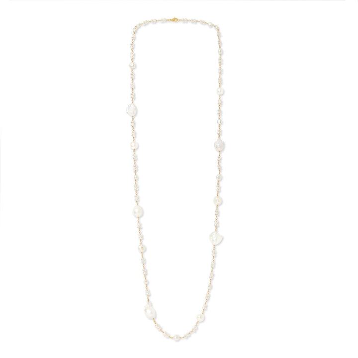 The Decus Baroque Cultured Freshwater Pearl Necklace by Pearls of the Orient Online is a one-of-a-kind, statement piece. This long necklace is a combination of large baroque and button-shaped cultured freshwater pearls on gold-plated copper pins with a gold-plated copper lobster clasp. It can be worn long or doubled up.