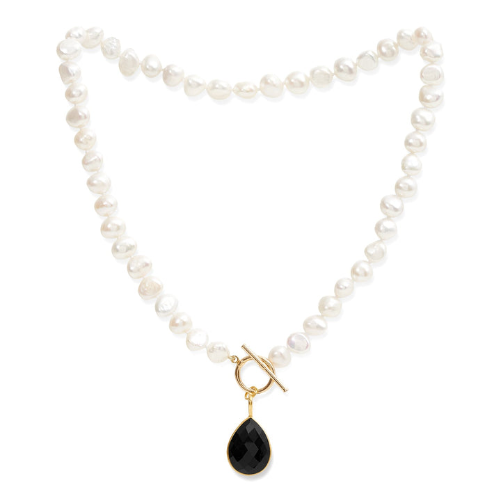The Clara White Cultured Irregular Freshwater Pearl Necklace With Spinel Gold Vermeil Drop by Pearls of the Orient Online is a modern twist on a timeless classic. The necklace features a single strand of white irregular-shaped freshwater pearls with a spinel drop, creating a stylish monochrome look. This piece can be worn day or night, adding a touch of modern elegance to any outfit.