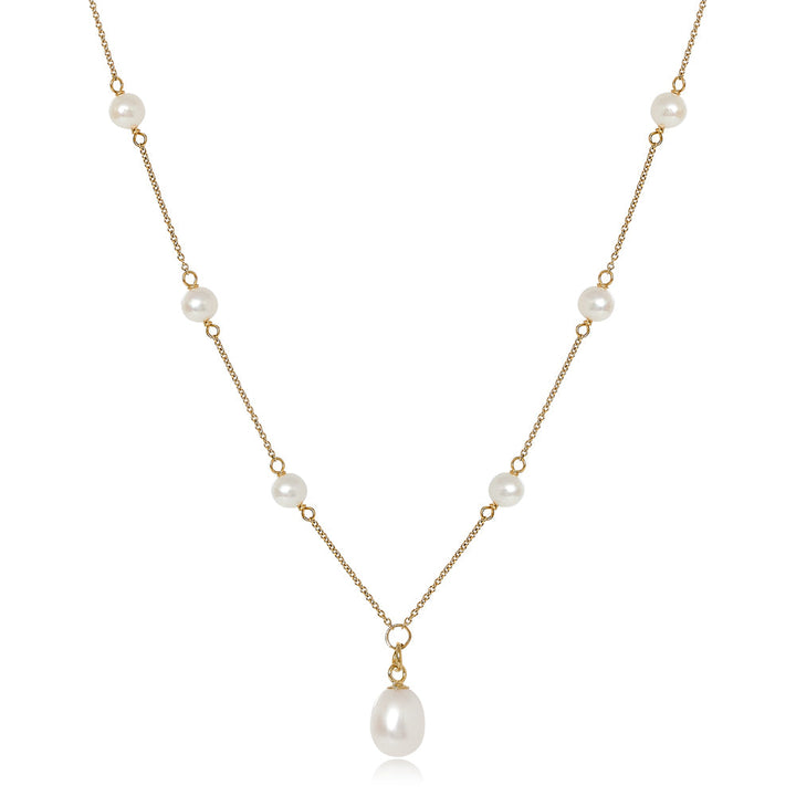 This necklace is crafted with a non-tarnish gold-plated chain and features small, almost-round cultured freshwater pearls and a teardrop-shaped pendant. It includes a gold-plated lobster clasp and is approximately 18 inches long.