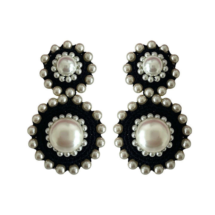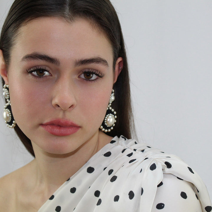 These Snow Storm Earrings by Pinar Ozevlat are a unique and luxurious accessory. They combine a contemporary design with handmade details, featuring intricate crochet work with elegant pearls. The black and white color scheme creates a modern statement piece, and the luxurious pearls and gold-plated brass post add a touch of sophistication.