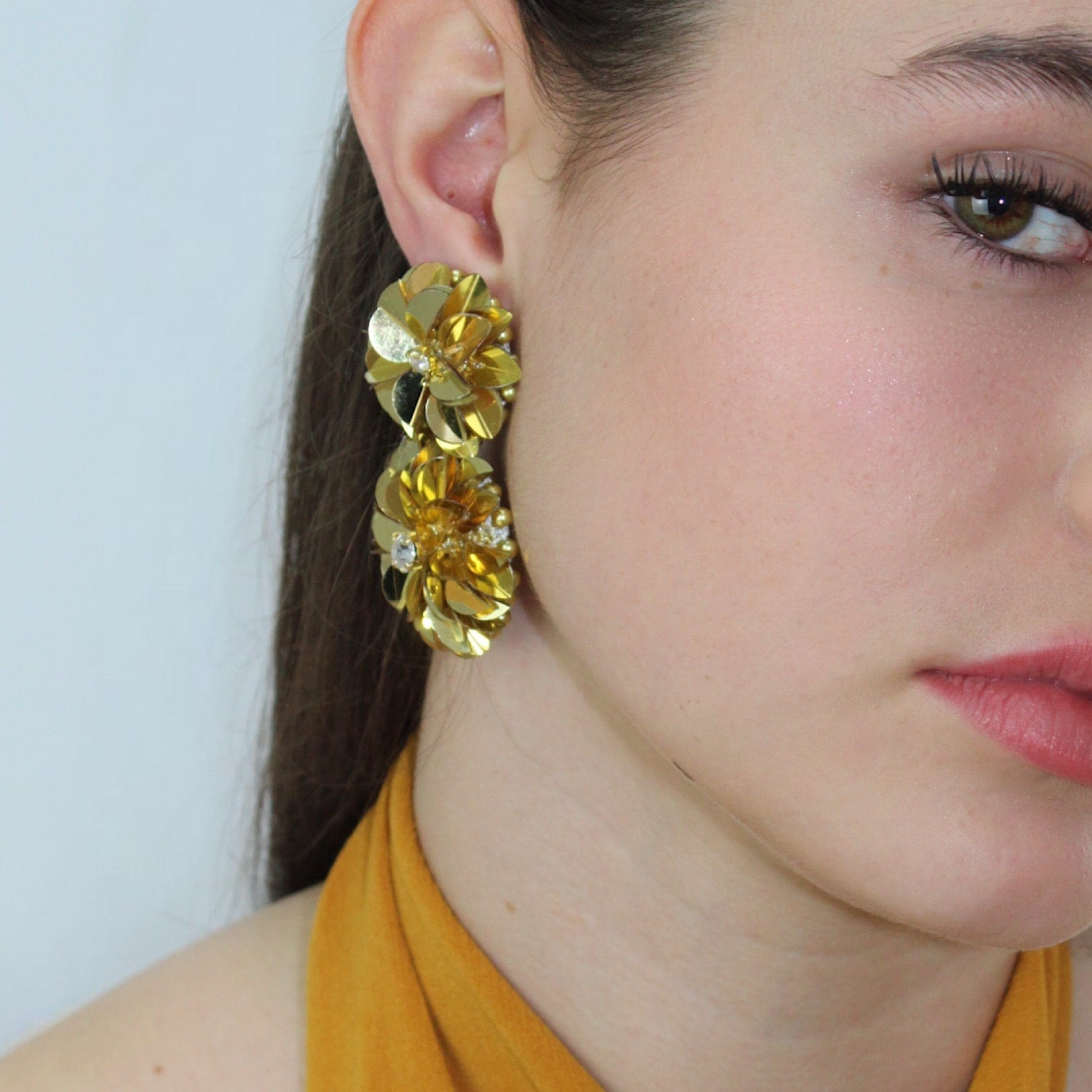 These Blossom Drop Earrings Gold by Pinar Ozevlat are a unique and eye-catching accessory. These statement earrings, which are handmade with luxury embroidery, are inspired by the signature Blossom design. The product details include pearl cotton thread, Preciosa crystals, sequins, and gold-plated brass.