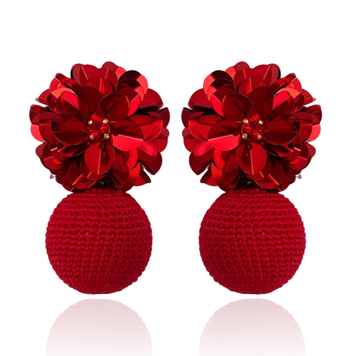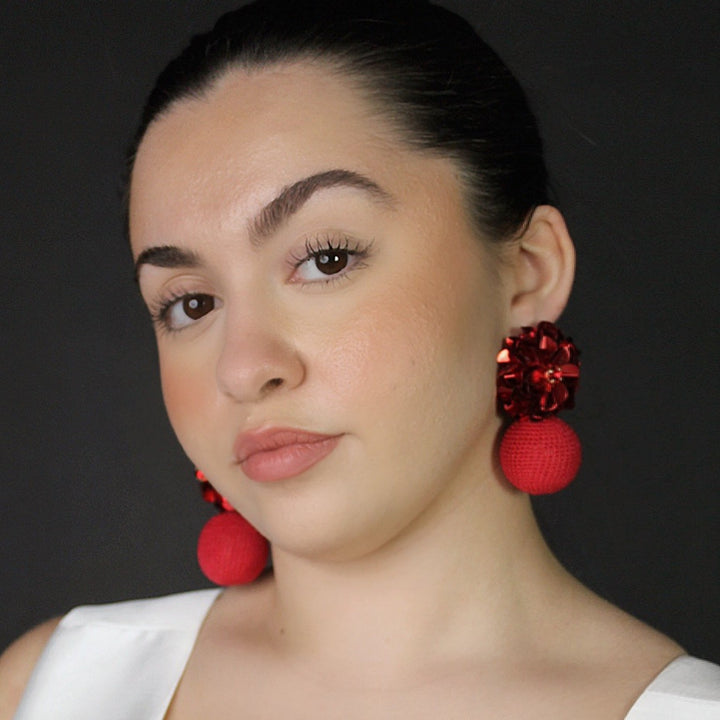 These Blossom Bon Bon Red earrings by Pinar Ozevlat are a vibrant and textured statement of feminine style. The fine crochet work creates a unique and intricate design, while the bright red color and sparkling crystals and sequins give them a big personality. These earrings are a wearable work of art, perfect for someone who isn't afraid to express themselves with bold color and texture.