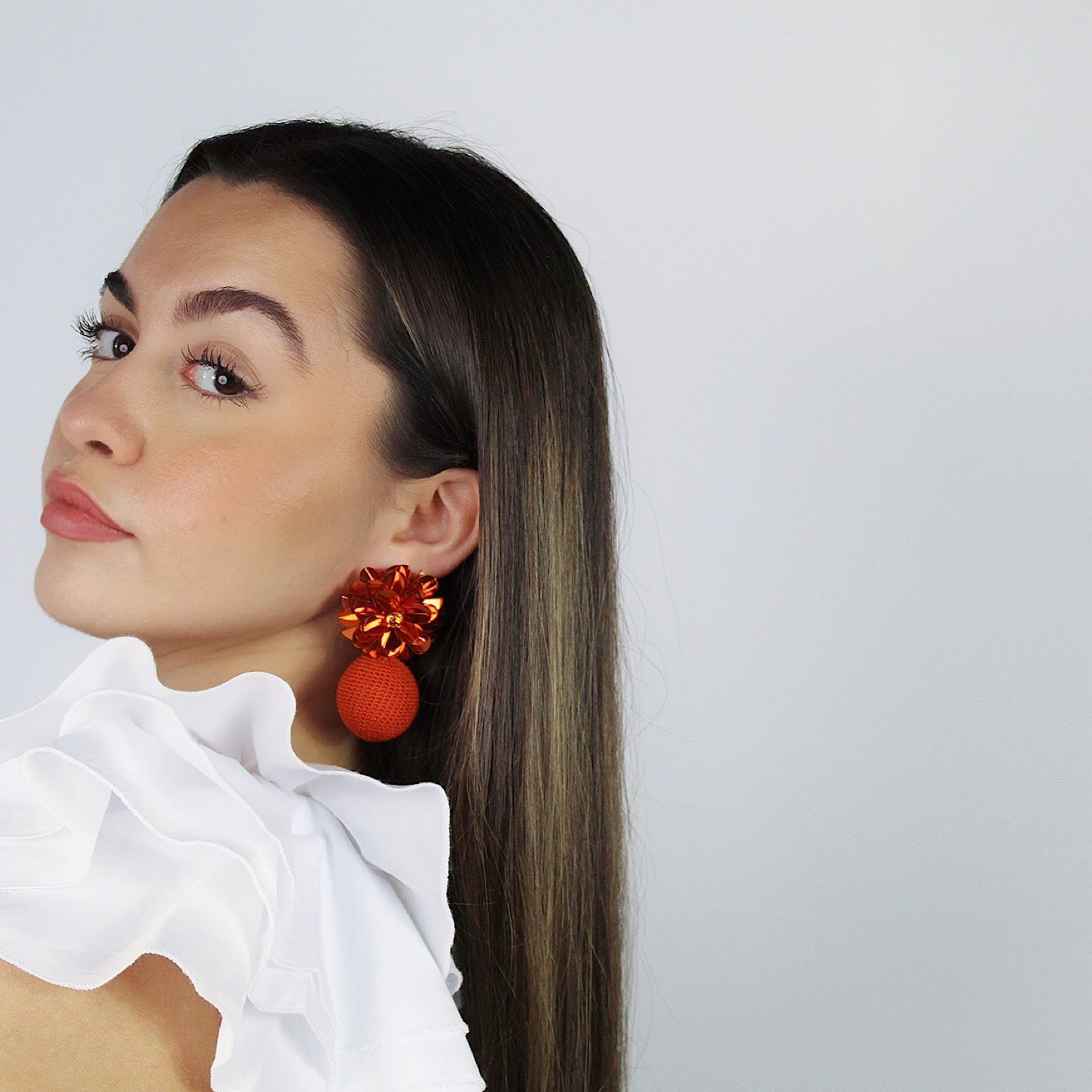 These Blossom Bon Bons Orange by Pinar Ozevlat are a vibrant and cheerful statement of feminine style. These dangle earrings are big on texture and personality, with intricate crochet work, sparkling crystals, and sequins. The bright orange color gives them a lively feel, while their bold design makes them a unique and elegant accessory that will be cherished for a lifetime.