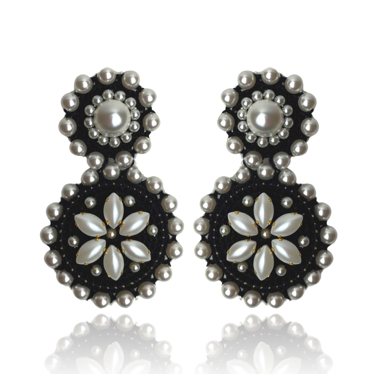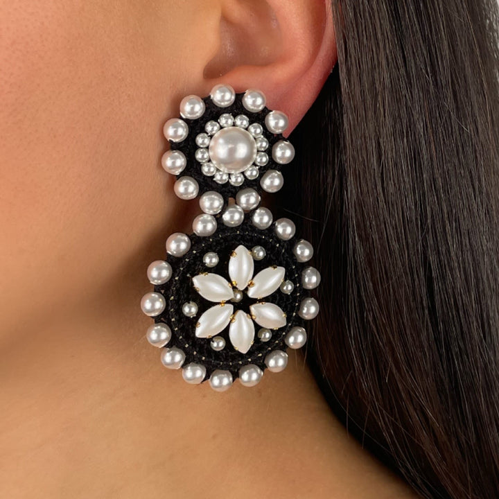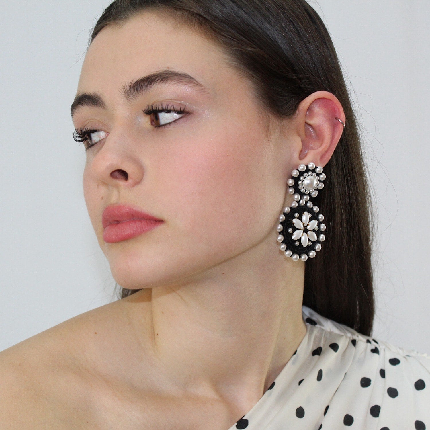 These Flower Drop Black & White by Pinar Ozevlat are a chic and feminine statement. These earrings convey the beauty of fine crochet work with the use of white pearls that form a signature flower motif. This versatile pair is perfect for transitioning from day to evening wear.