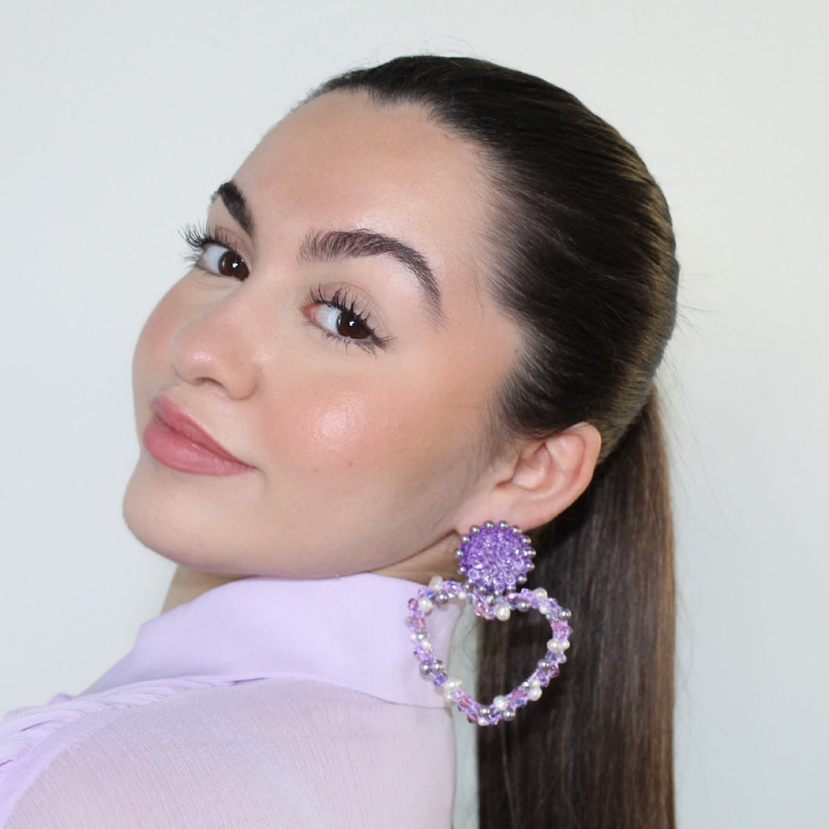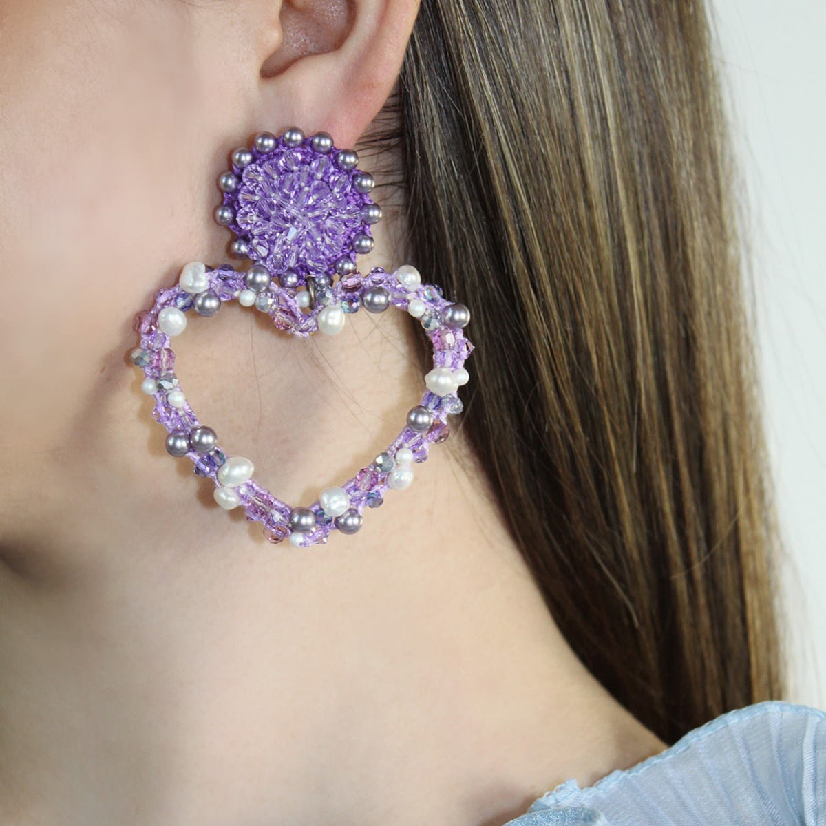 The Queen Of Hearts Lilac by Pinar Ozevlat are an absolute showstopper. Beautifully handcrafted in crystals and glass beads, they convey the beauty of fine crochet work. These earrings are a stunning statement piece that adds a touch of whimsical romance and glamour to any outfit.