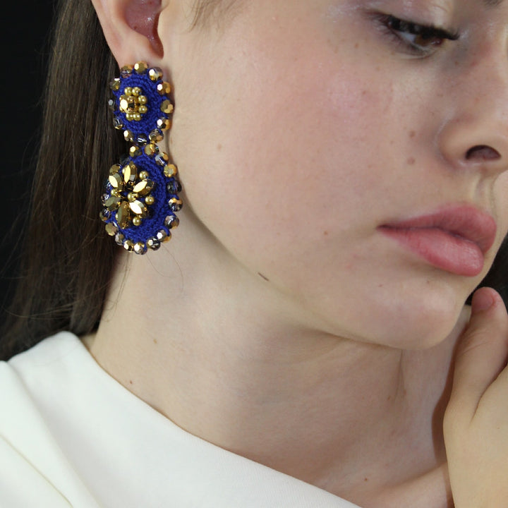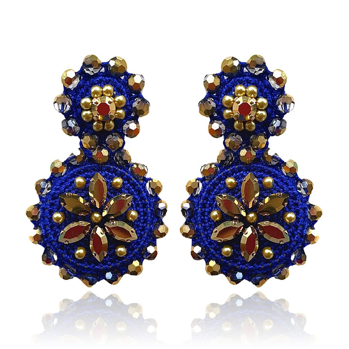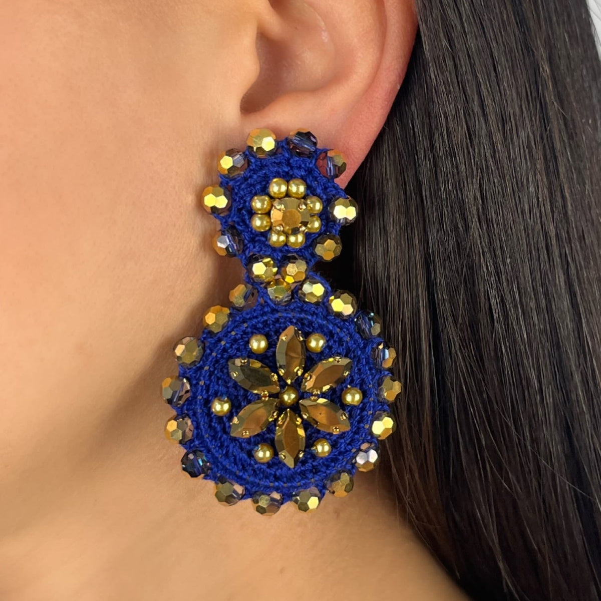 These earrings are handcrafted from pearl cotton thread, Preciosa crystals, and a gold-plated brass post. They feature sapphire crystals.