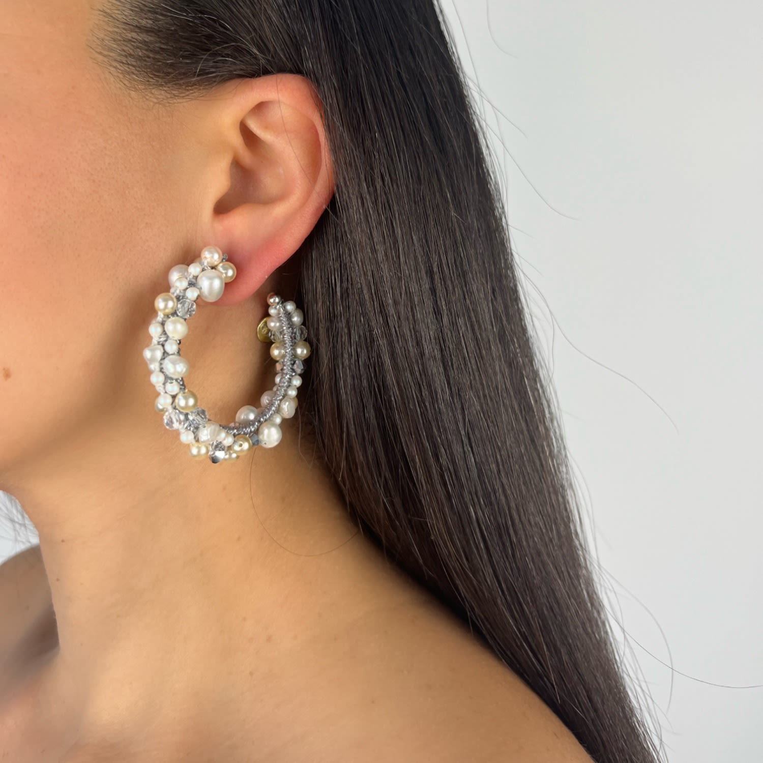 These hoops are silver-plated and hand-embellished with a mix of pearls (Preciosa, Swarovski, and Freshwater) and Preciosa crystals.