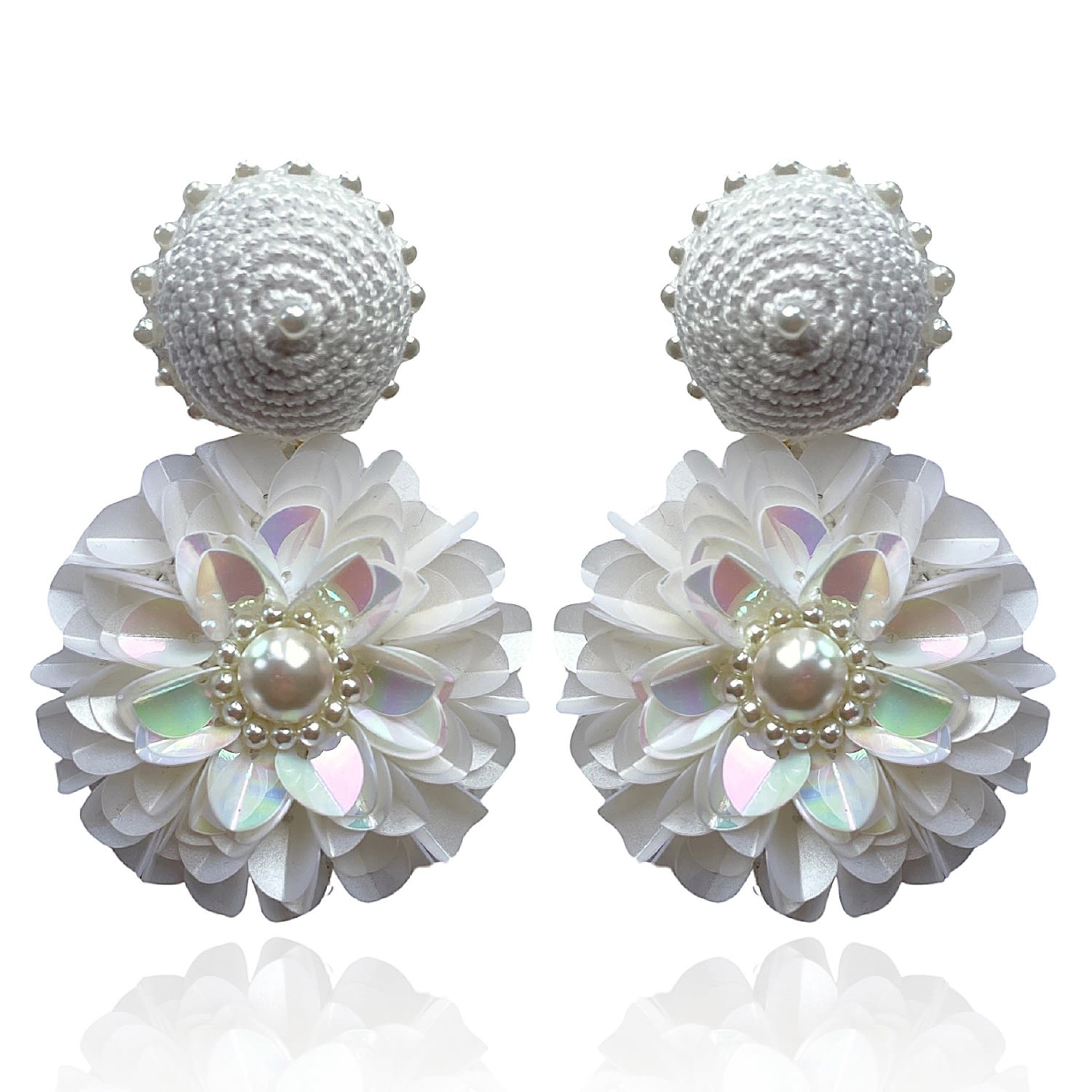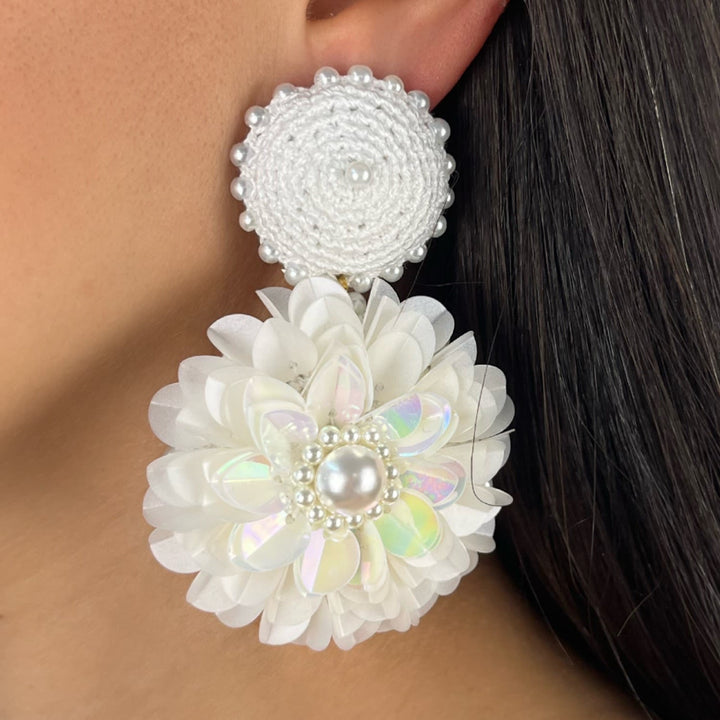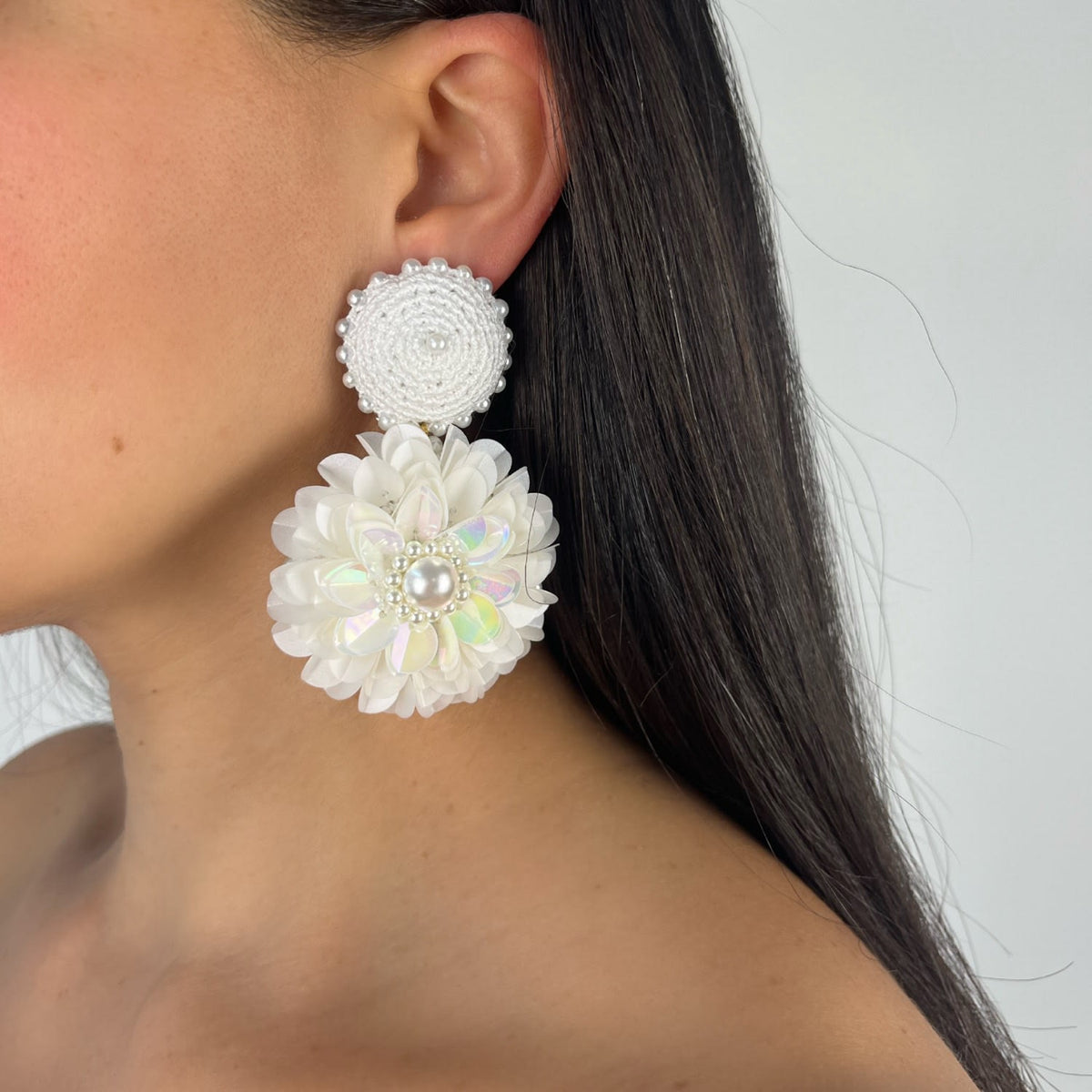 These Snow White Dahlias Earrings by Pinar Ozevlat are a celebration of elegance and personality, inspired by the Dahlia flower. Handcrafted with traditional hand-sewing techniques, they showcase the exquisite beauty of fine crochet work and a rich texture. The combination of pearls and sequins creates a subtle sparkle, while the gold-plated brass omega post ensures they sit beautifully. These earrings are a unique and artistic statement, perfect for the woman who appreciates meticulous craftsmanship and timeless design.