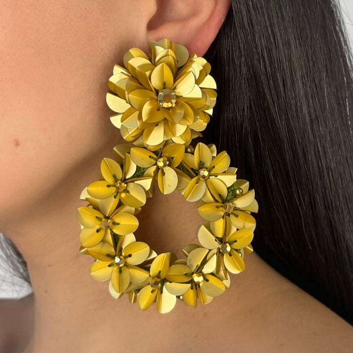 These dangle earrings are handcrafted with pearl cotton thread, sequins, Preciosa crystals, and Swarovski pearls. They feature a gold-plated brass omega post.