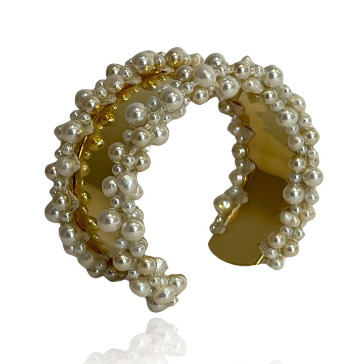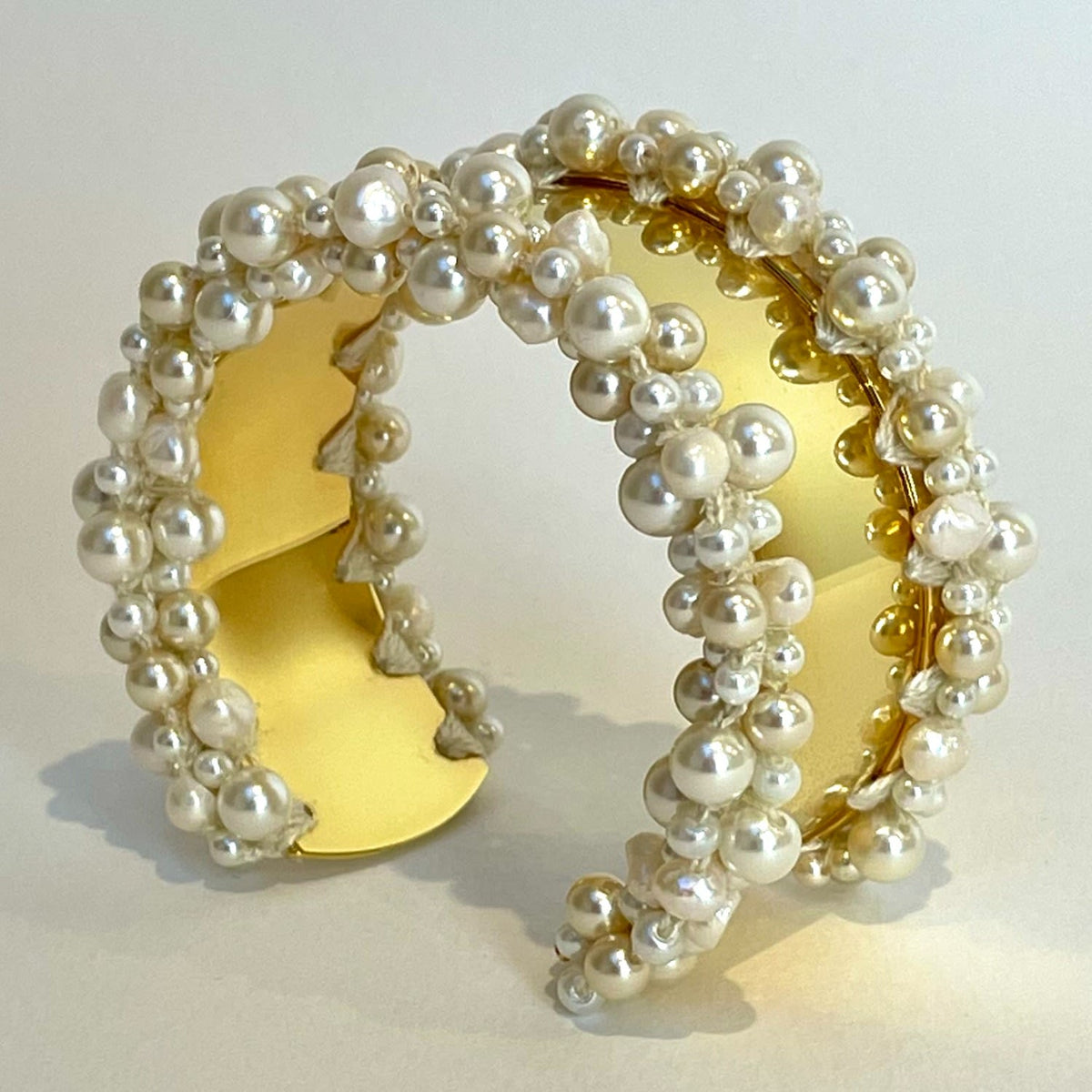 This bangle is crafted with a gold-plated brass cuff and features a pearl cluster made of pearl cotton thread, crystal pearls, and freshwater pearls.