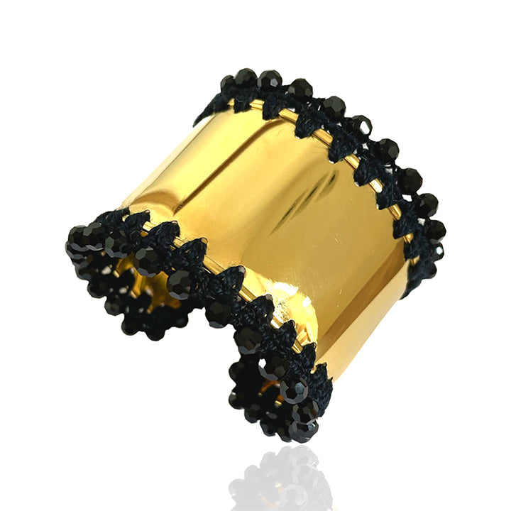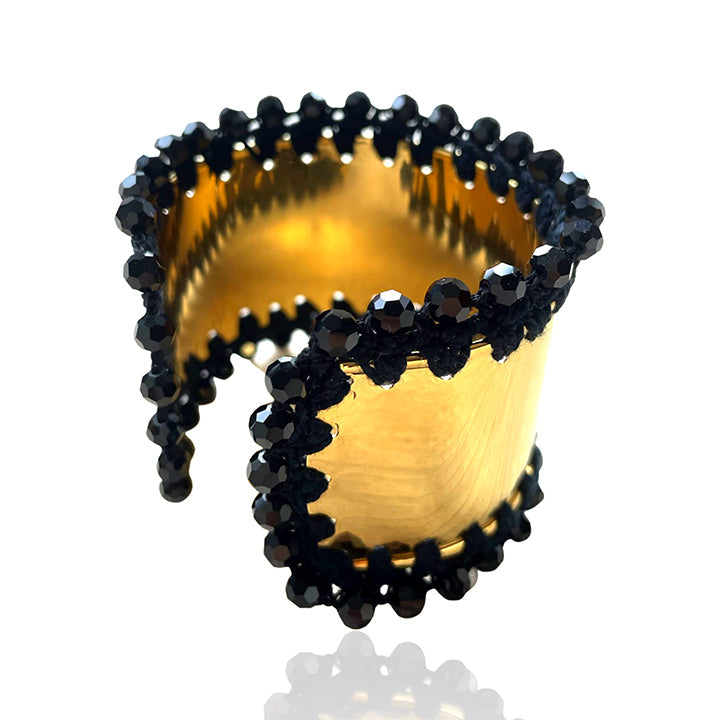 The Ivy Cuff by Pinar Ozevlat is a statement solid brass cuff. It is skillfully crocheted with Preciosa crystals around the edges, adding elegance and sophistication. This cuff is a beautiful accessory that can add an element of surprise to your daywear or emphasize your evening glam.