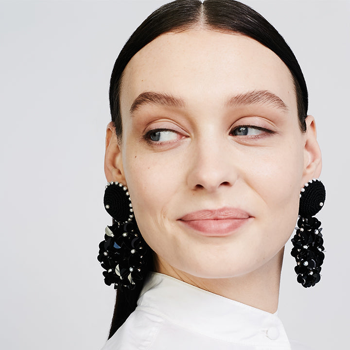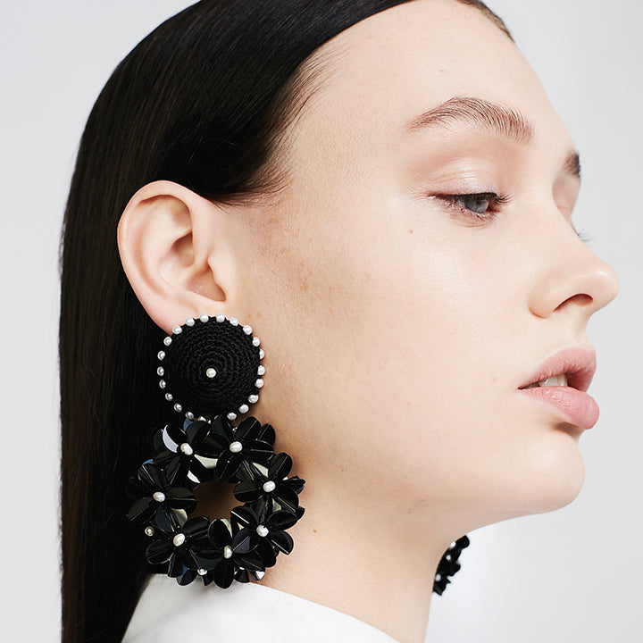 The Petite Yasmine Hoops Black by Pinar Ozevlat are a signature pair of statement hoop earrings. Inspired by the jasmine flower, these hoops are full of character and texture, conveying the beauty of fine crochet work. They are made with Swarovski Pearls, Freshwater Pearls, and Glass Pearls and have a Gold Plated Brass Omega Post.