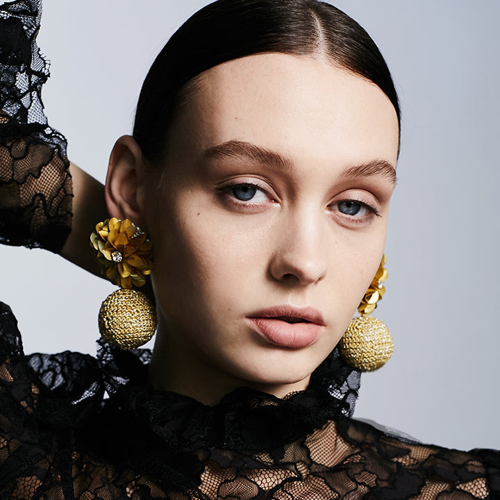 The Blossom Bon Bons Gold Earrings by Pinar Ozevlat are feminine, dangle earrings with a lot of texture and personality. These gold-toned earrings are perfect for a night out and convey the beauty of fine crochet work. They are made with various pearls and crystals and have a Gold Plated Brass Omega Post.